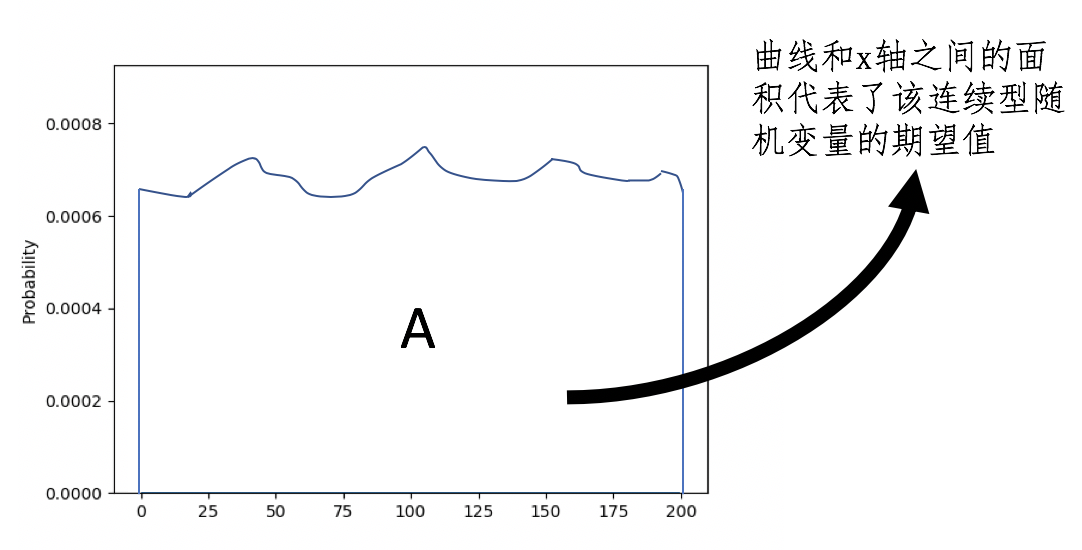 有了离散型的基础,连续型变量的期望值就很好理解了。一维连续型随机变量的概率分布,由直方图变为了连续曲线和x轴之间的区域。我们将这个区域记作A,所以期望值就是区域A的面积。