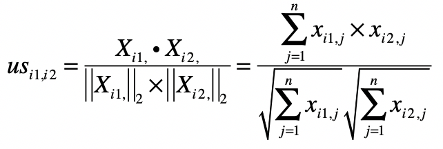 我们可以使用向量空间模型中的距离或者是夹角余弦来处理,在这里我使用了夹角余弦,其中$us_{i1}$,$i2$表示用户$i1$和$i2$的相似度,而$X_{i1}$,表示矩阵中第$i1$行的行向量,$X_{i2}$,表示矩阵中第$i2$行的行向量。分子是两个表示用户的行向量之点乘,而分母是这两个行向量$L2$范数的乘积。