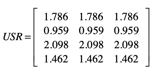 为了实现上面这个公式的分子部分,我们可以使用$US$和$X$的点乘。我们假设点乘后的结果矩阵为$USP$。这里我列出了根据示例计算得到的矩阵$USP$。