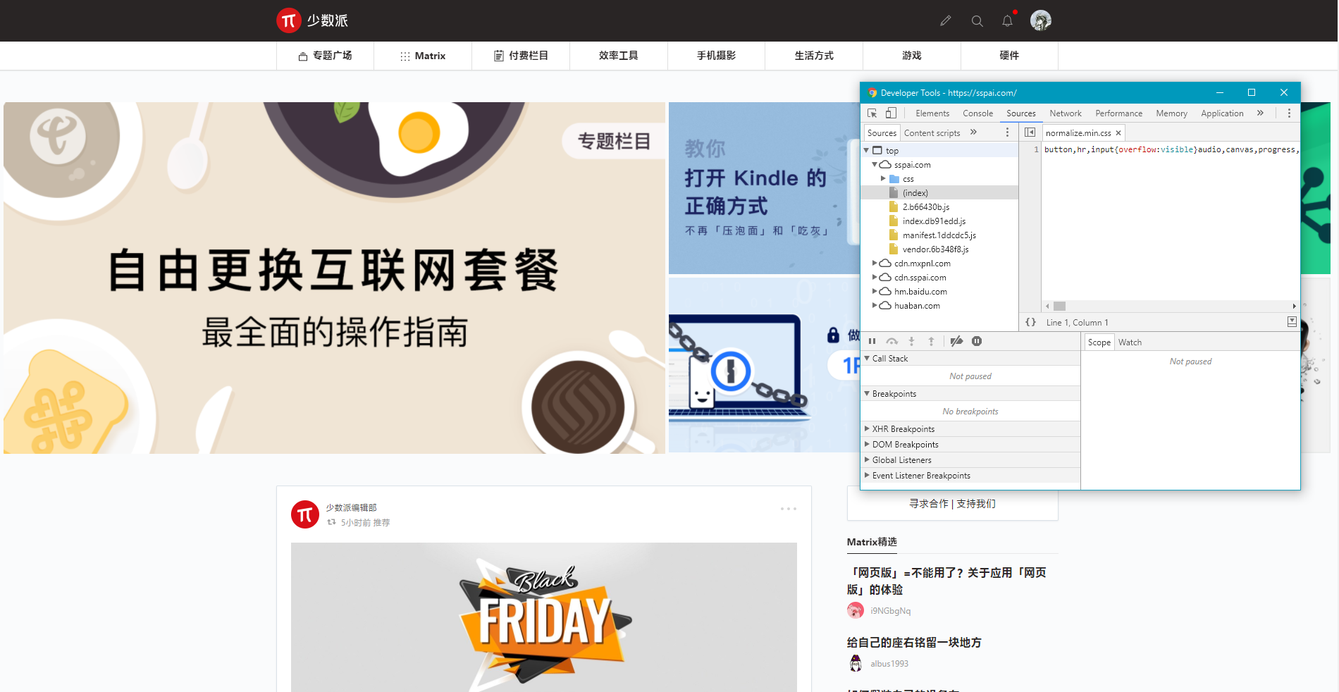 浏览器中打开控制台(快捷键 Windows:F12;Mac OS:Command + Option + I),在资源(Sources)中能看到浏览器「下载」了哪些文件来显示网页。