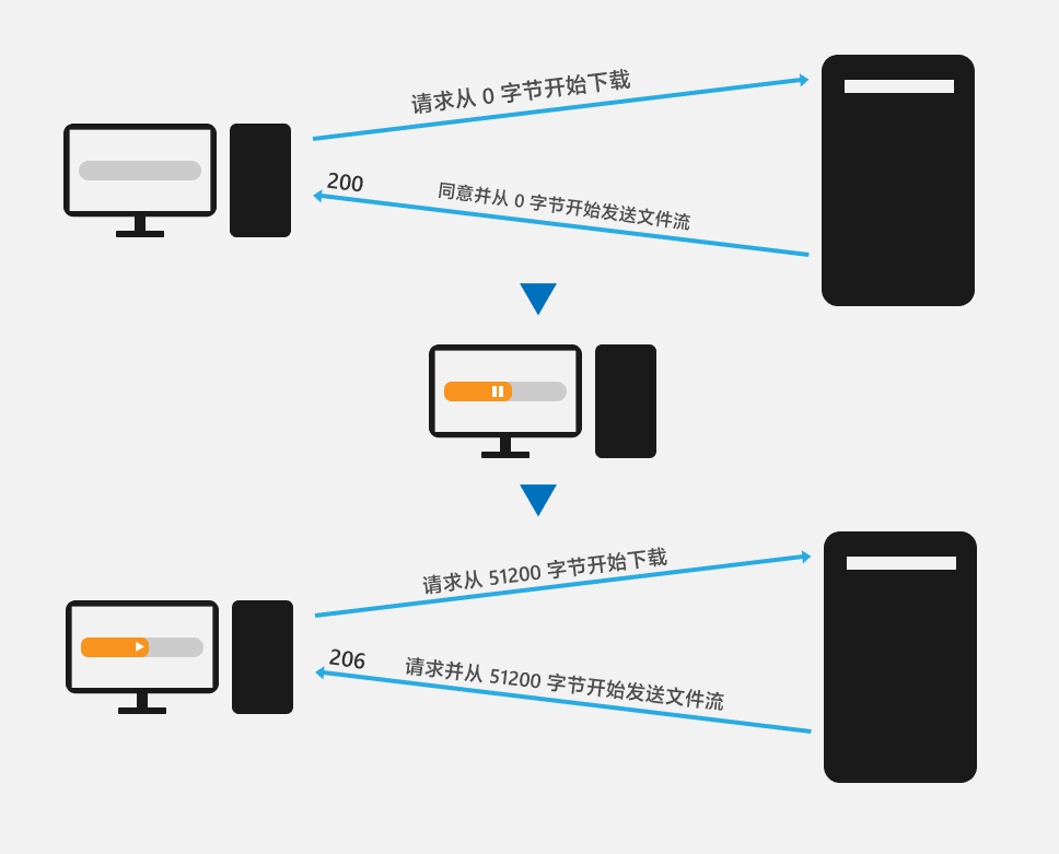 以一个 1MB 的文件为例,当你下载了 512KB 然后按下暂停下载按钮的时候,什么也不会发生。只有在你下次继续下载的时候,支持断点续传的客户端才会以字节数的方式直接在请求头(Header,每次请求就像寄信,Header 就像是信封上的信息,包含双方地址身份信息和其他自定义信息)告诉服务器我需要从第 512000 字节开始下载,支持断点下载的服务器(现在不支持这个的服务器已经濒临灭绝了……)就会从 512000 字节开始传输流并返回一个表示「这是续传」的特殊状态码 206(状态码用来表示目标服务器或者域名解析服务器对这个请求的「态度」,像是我们常见的 404 就是表示「我不存在」的状态码)以说明这个不是重新下载的流。