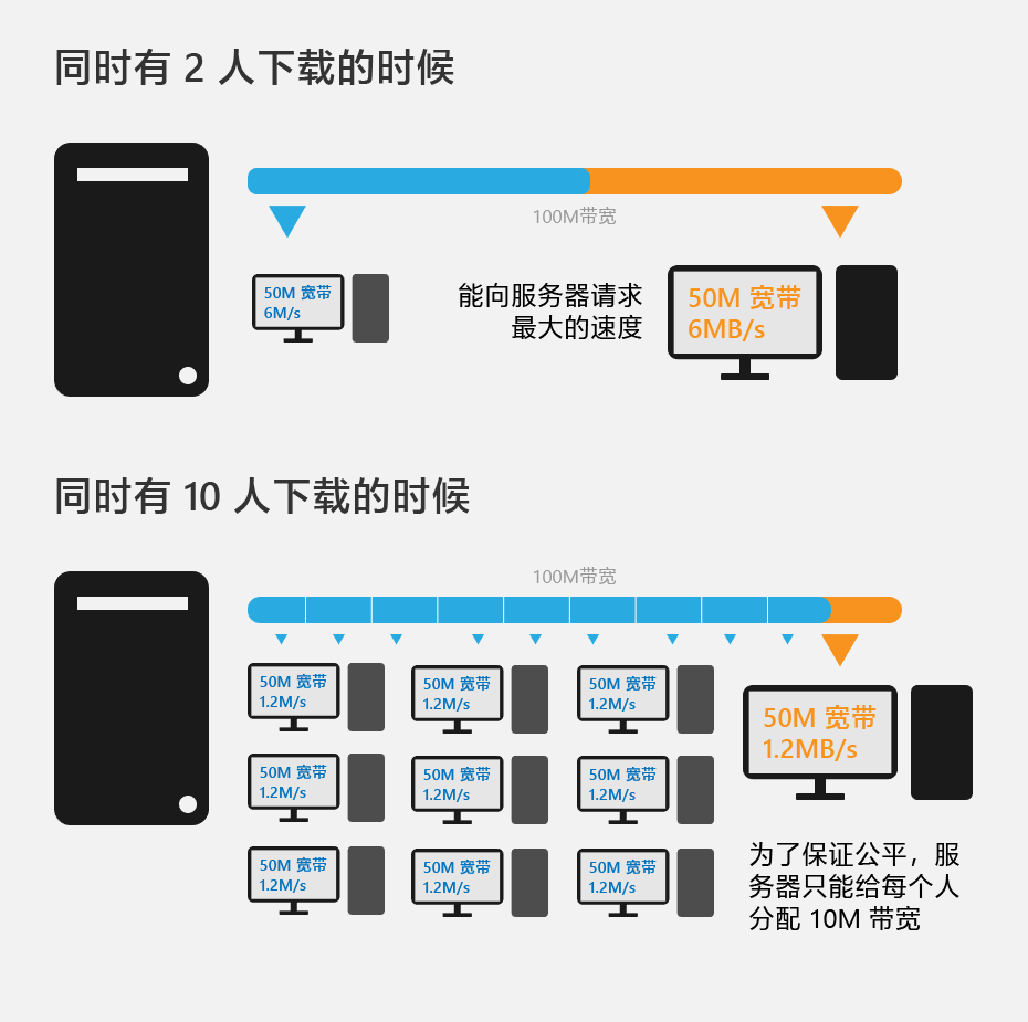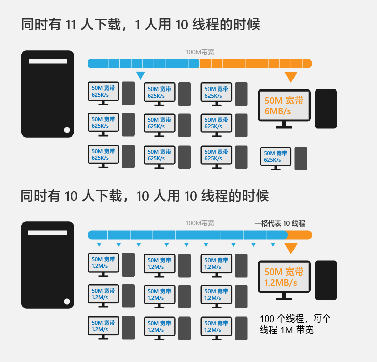 一般的服务器(除去那些故意限制用户速度的)是通过同时下载的线程数平均分配下载带宽,假设一个服务器上的某个文件最高享有 100M 的带宽,同时有 50 个线程下载的时候每个线程分到的下载速度即是 2m/s。可是单纯的服务器认为一个人只能用一个线程来下载,怎想到其中 10 个线程都是同一个人用多线程下载器请求的,那这个人分到了多少下载速度?