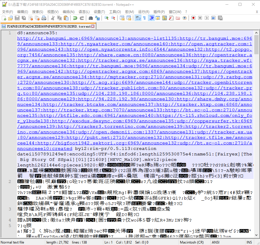 当用记事本或者其他文本浏览器打开这个种子文件,看到的是一大串类似于链接的字符串,后面跟着的是谁都看不懂的乱码(大家也可以自己试一下打开电脑上的种子文件):