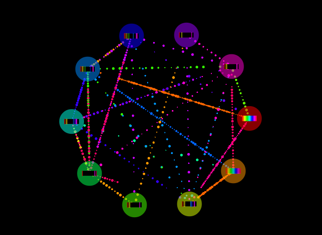 就这样,在这样你帮我我帮你的「愉快」氛围下大家下载少数派大电影的速度都轻松飙满,不一会儿就全下完啦。不过即使你已经下载完成,这种对话也会一直持续,直到你停止上传或退出客户端为止。有一个重点是这些文件数据交换并不是按照某一个特定的间隔或顺序发生的,每个用户(peer)和其他用户之间都会发生这些对话,视觉化之后有点像我们小时候做的「N 点之间有多少连线」的数学题。