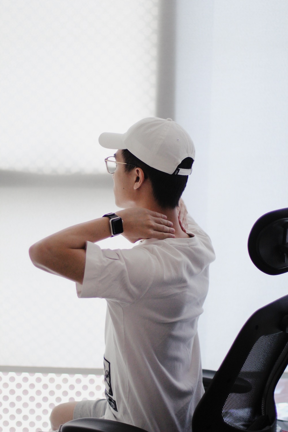 可以很明显地感受到,维持这个坐姿时,脖子两侧的肌肉是僵硬的。当你驼背加上抬头看向前方时,你头部数公斤的重量就压迫在颈椎的关节之上。导致关节受压、肌肉紧绷、血液循环不良。