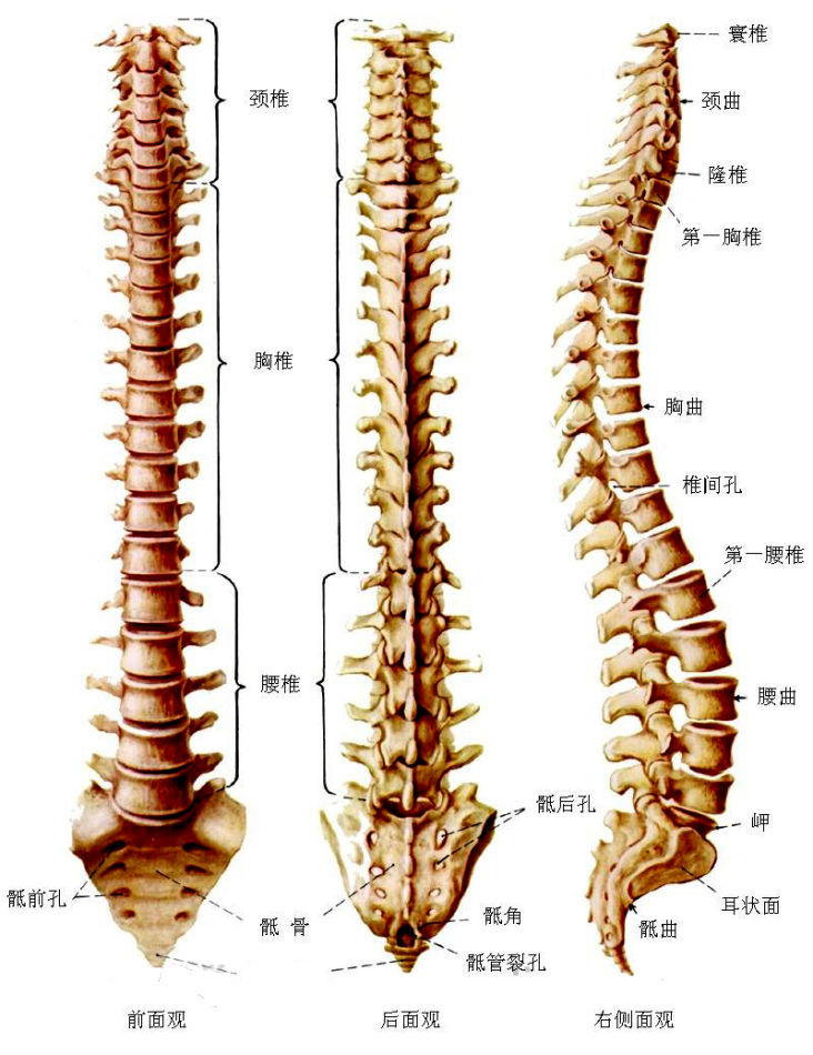 脊柱是我们身体的支柱,位于背部的正中,脊柱包括 33 块椎骨,分为颈、胸、腰、骶、尾 5 个部分,它们分别是 7 块颈椎、12 块胸椎、5 块腰椎、5 块骶骨和 4 块尾骨。脊柱的形状如同柱子,中间有椎管,内有脊髓。正常情况下,脊柱有 4 个自然生理弯曲,即颈椎前凸、胸椎后凸、腰椎前凸和骶椎后凸。这也使得脊柱从侧面看呈S形。脊柱能够保护内脏、支撑躯干、保护脊髓、参与身体运动。
