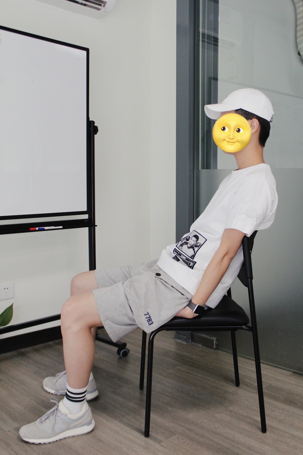 首先,找张椅子坐下,我们试试上身没有弯腰驼背的感觉: