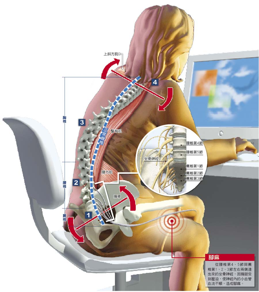 跷二郎腿坐着的时候,身子很容易弯腰驼背。腰椎和骶椎因此被紧紧地压缩在一起,「S」形的下半部分消失了,变成了「C」形。如此,又会导致胸椎和腰椎的压力分布不均;长此以往,就会压迫到脊神经,引起背部和腰部疼痛。