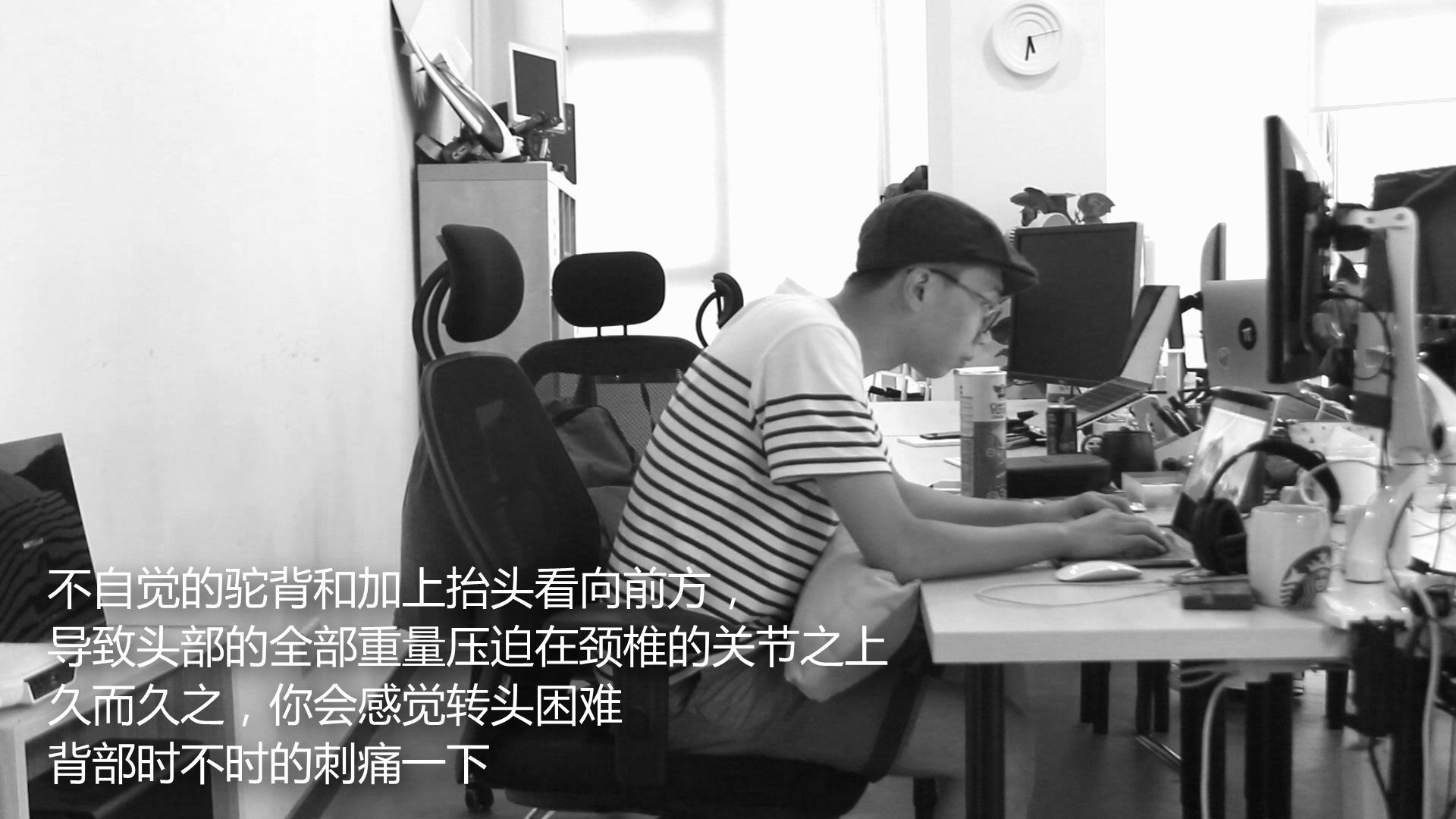 最近有意观察了一下,我所有的同事,在上班的时候都有不同程度的弯腰驼背。在我印象中,大部分人坐着的时候,都习惯弯腰驼背。很容易理解为什么会有这样的习惯,因为弯腰驼背的时候你的腰背肌肉是松弛的。但这样就会使颈椎长时间处于向前屈的疲劳状态,同时颈后肌群也持续处于强直状态,违背了颈椎正常的生理曲线,从而引发颈椎病。
