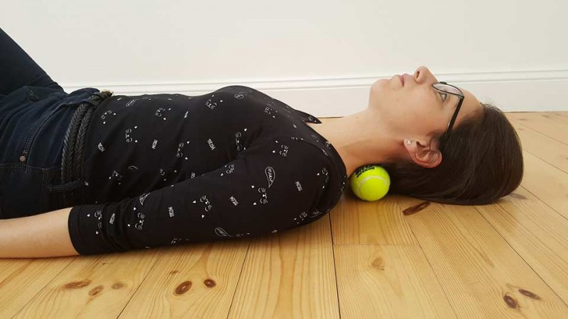 当你躺着时候,把袜子球放在后脑勺的位置。以头转带动的方式,左压五秒、右压五秒,重复十几二十次来放松枕下肌群。这样就能让头痛的症状立即获得舒缓。而过程中都保持轻压即可,若是压一压反而会让你头晕、头痛加剧的话,就代表你不适合这个方法。