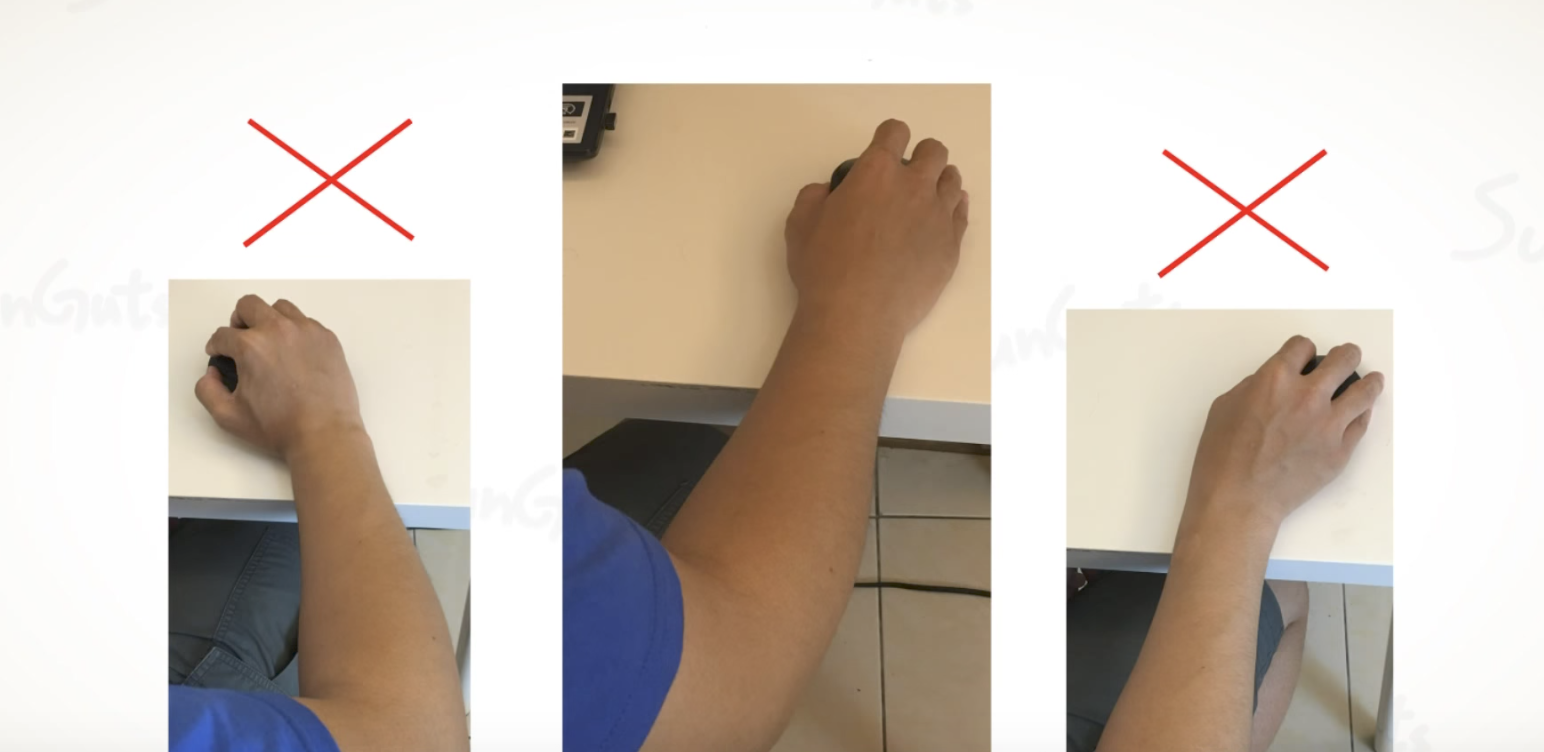 大部分手肘酸痛都是在手朝上的时候,大拇指侧的手肘凸点在痛。会导致这样的状况,通常都是因为使用鼠标的时候,桌椅的高度不恰当。使得你的手臂放在桌面上的时候,手肘的角度不是一个肌肉好施力的位置。过于弯曲或是过于伸直,都会使得手肘的肌肉得花费数倍于恰当姿势的力量。才能够完成移动鼠标这个简单的小小工作。久而久之,当然会使得手臂外侧的肌肉疲劳损伤导致疼痛。