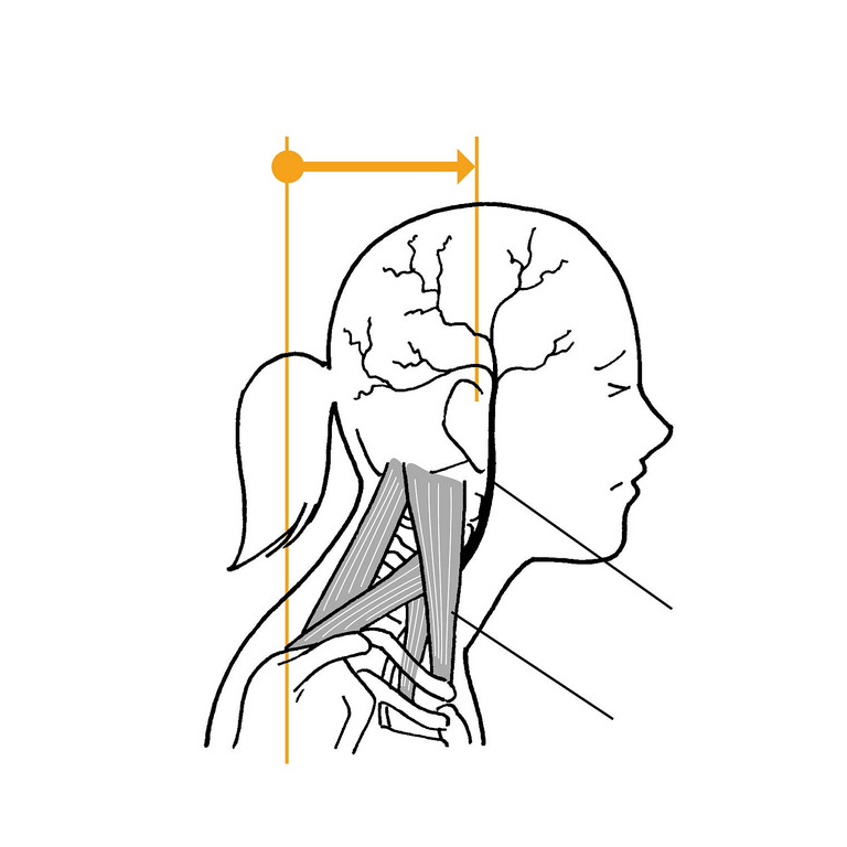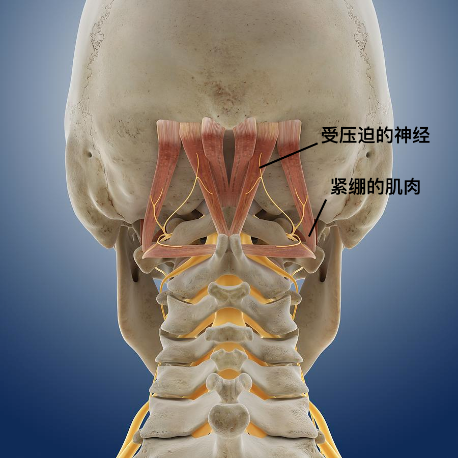 在我们后脑勺下方,与颈椎的交界位置。有着持续工作的枕下肌群,它们负责头部的微调动作。只要你的头有在动,它们就得工作。只要当你长时间低头看手机、看文件、用笔记本电脑,都会使得这组肌肉群过渡疲惫而变得紧绷。然而,就是这么刚好,有条叫做「枕骨神经」的直接穿过这组枕下肌群。再往上绕至后脑勺、往旁边绕到耳朵。