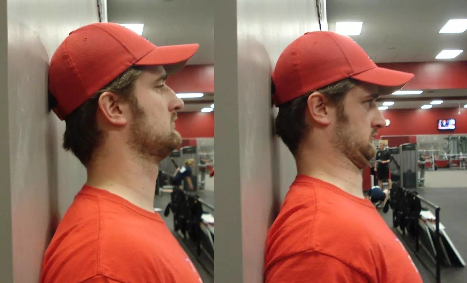 这个动作在下巴后缩到极限时,停留一两秒钟,然后放松,从第一个动作开始,重复做二三十次。过程中你会觉得脖子后面的肌肉被拉伸,有些紧绷的感觉,这是正常的反应,而且说明你做对了。如果凭空做这个动作不得要领,可以放松靠墙站立,此时后脑勺不会贴住墙。根据上面三个动作,最后一步,头部会顶住墙,可以适当的对抗一两秒,然后放松、重复。