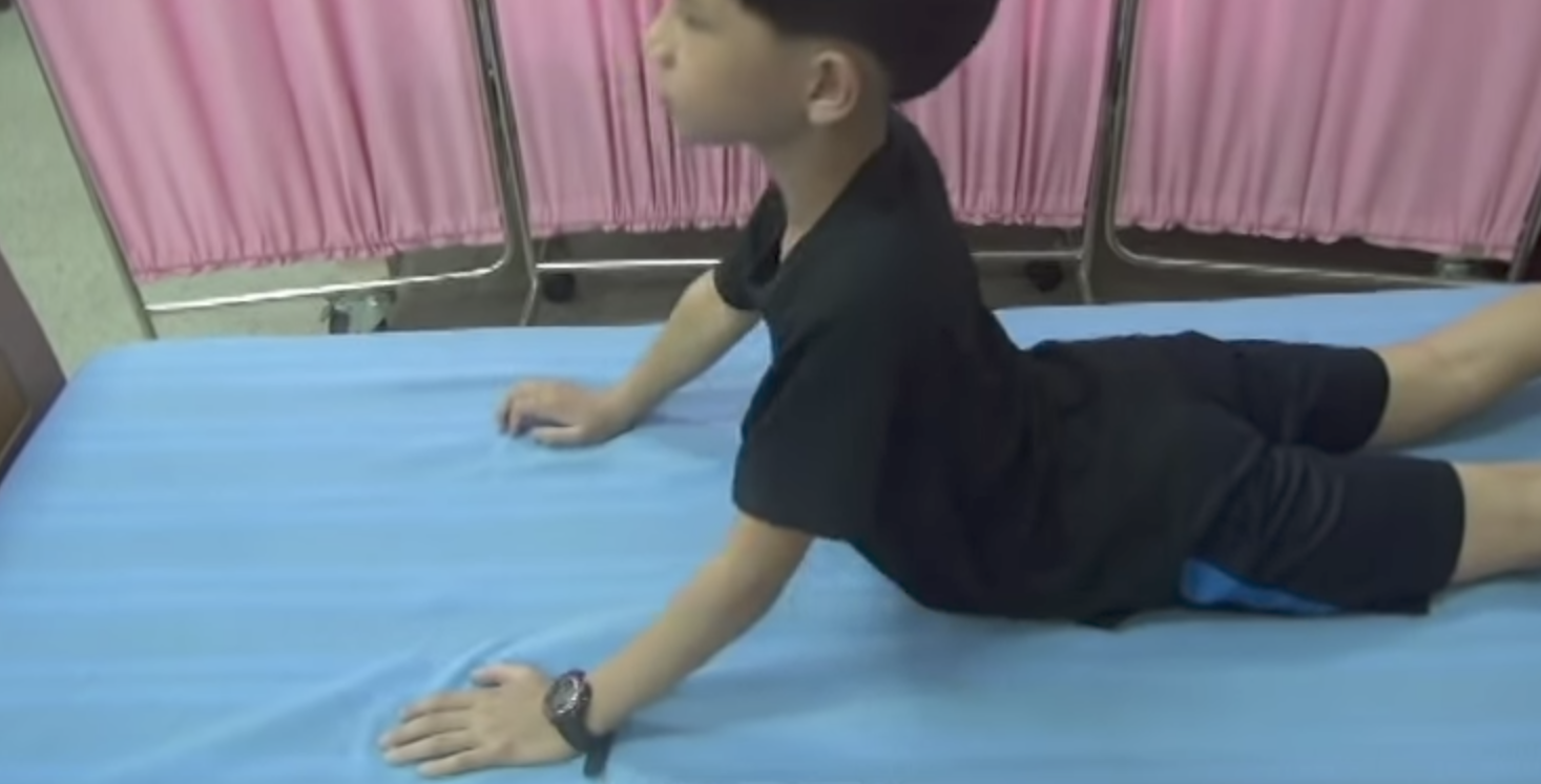 预备动作是趴在平面上,两手放在耳旁。平面最好有一定的硬度,不宜过软。