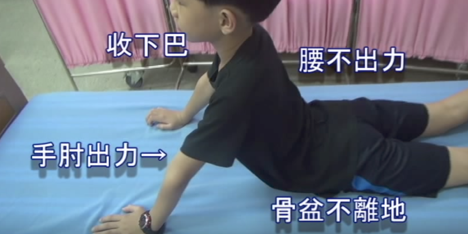 注意,动作的过程中,骨盆不要离开平面,腰部尽量不用力,由手肘来发力。保持下巴是收回的状态。