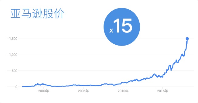 如果你看看标普 500 指数,可能会更好地理解这一点。从 2000 的 1500 点,到如今的 2600 点,在这 17 年的时间里增长了 70% 左右。而如果你挑选出一支标普 500 指数里的明星成分股,比如亚马逊,在这 17 年的时间里,股份则从 100 元上升到了如今的 1000 多元,整整翻了十倍。
