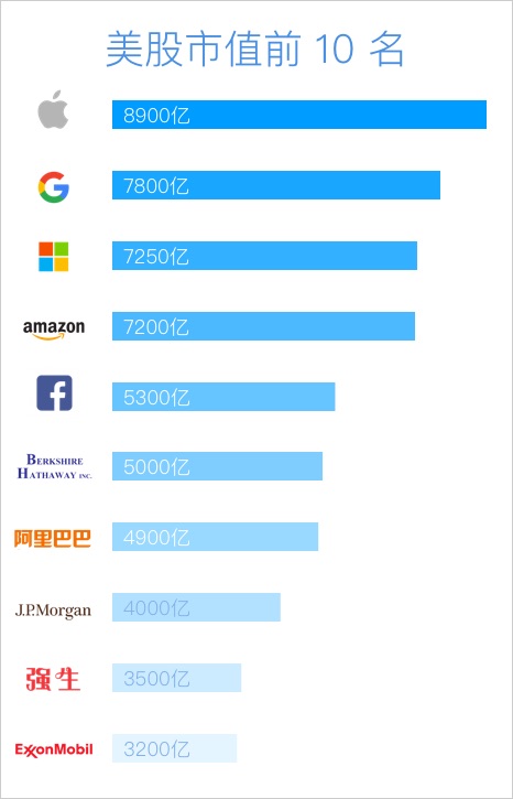 这十年的时间里,美股估值前十名的公司,也悄悄发生了变化。曾经最值钱的埃克森美孚,自从 2011 年被苹果超过,从榜首落下后,又相继被亚马逊等公司超过,如今只排在了市值的第十位。如今(以 2018 年 02 月 23 日收盘价为准)美股估值的前十名分别是苹果、谷歌、微软、亚马逊、Facebook、伯克希尔、阿里巴巴、摩根大通、强生、埃克森美孚,前十名中,有六名都已经被科技公司霸占。