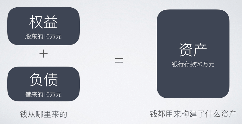 这就是一张最简单的资产负债表,也就是所谓的会计恒等式之一:所有者权益 + 负债 = 资产。