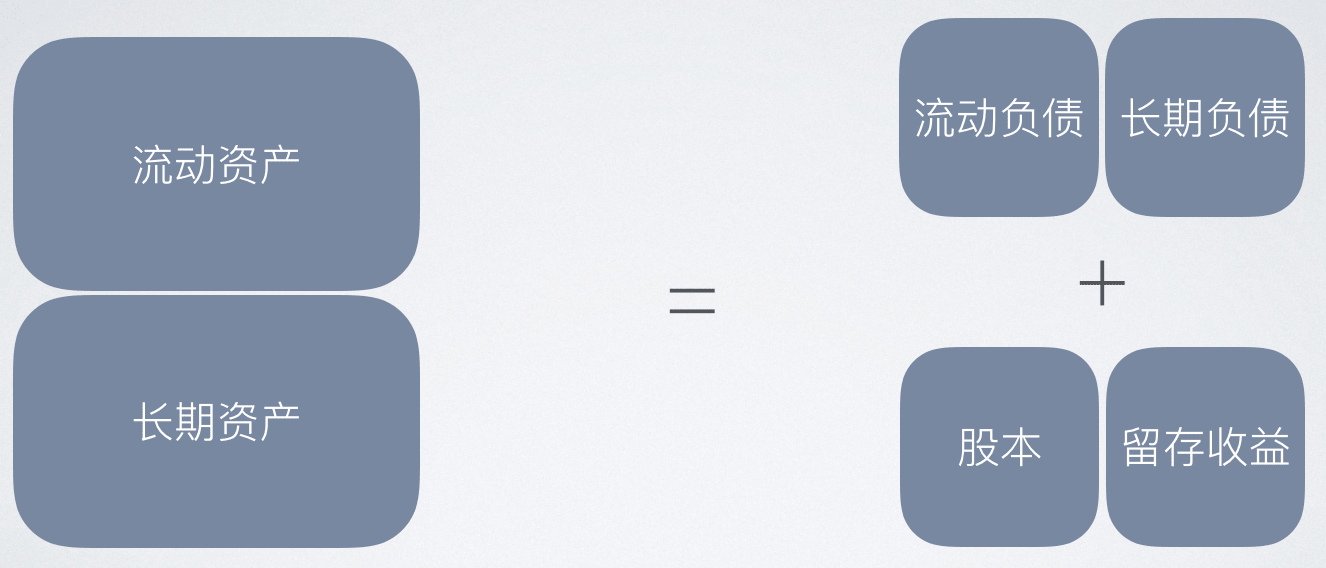 不过,现实中当然不会存在「存银行赚利息公司」,企业的经营业务肯定会更复杂一些。相对应的,在资产负债表上,人们往往会进一步将资产细分为流动资产、长期资产,将负债细分为流动负债、长期负债,将权益细分为股本、留存收益等。而且在习惯上,一般都是按资产、负债、权益的顺序编排资产负债表。