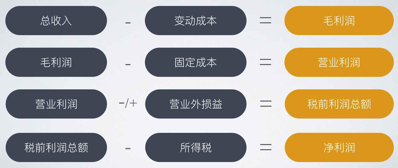 利润表的概念相对较简单,无非就是「收入 - 成本 = 利润」。这个过程反映的就是企业的经营,即如何利用资产负债表上的资产端,为企业创造收入,在扣减掉各项成本开支后,剩下的利润就是这一年赚到的钱。