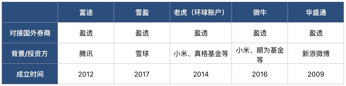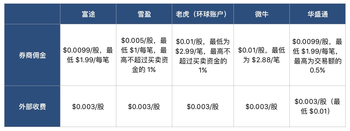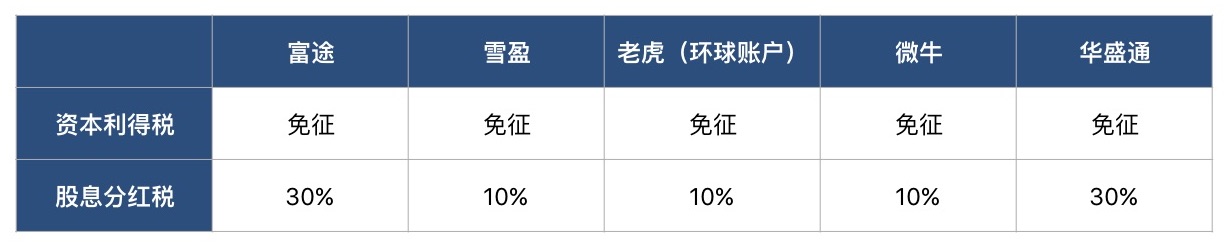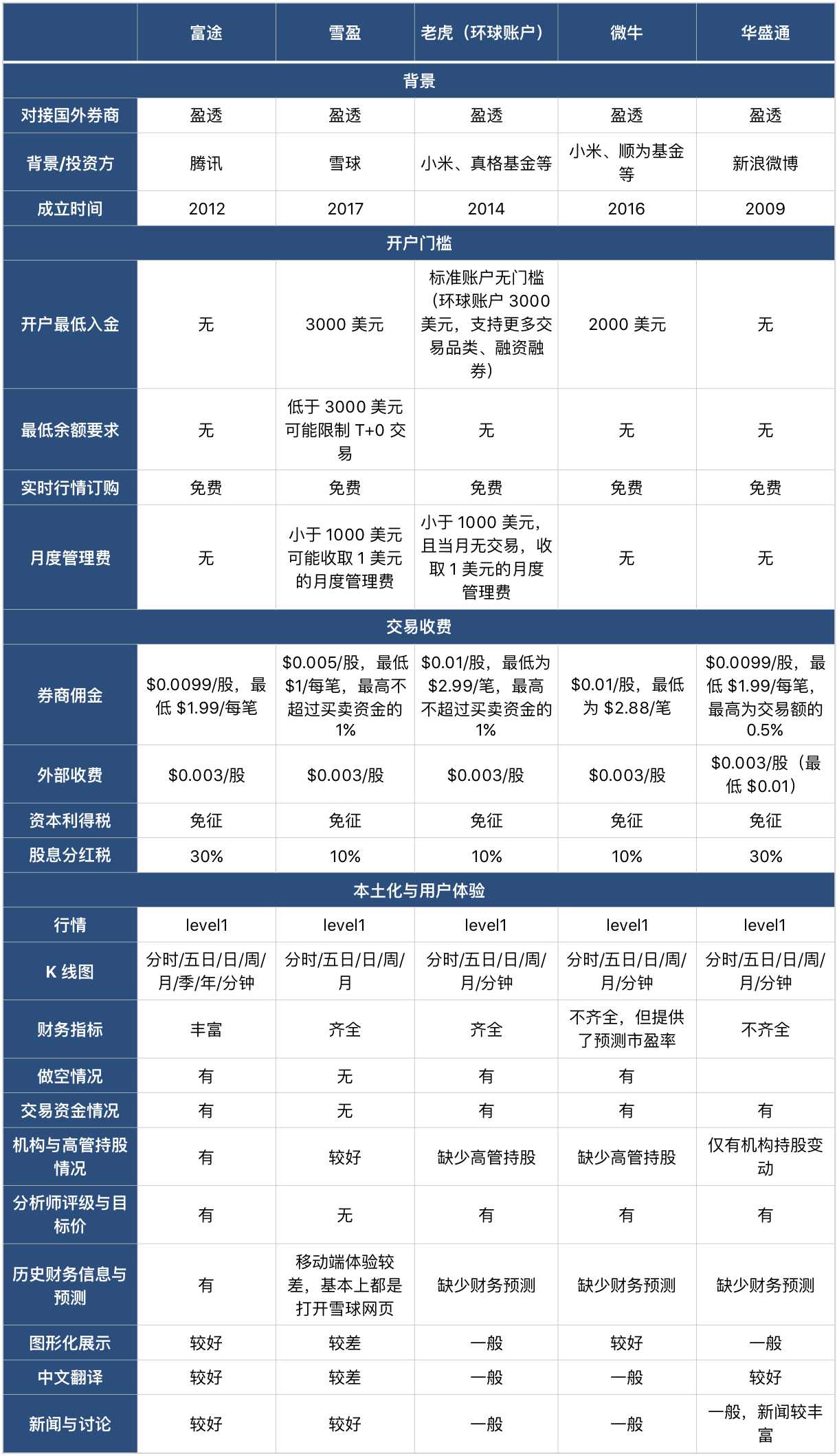最后,为了方便你比较,我们把前面所有相关的信息,在除去美豹后,将富途、雪盈、老虎、微牛、华盛通这五家券商统一绘制在了一个表格里。