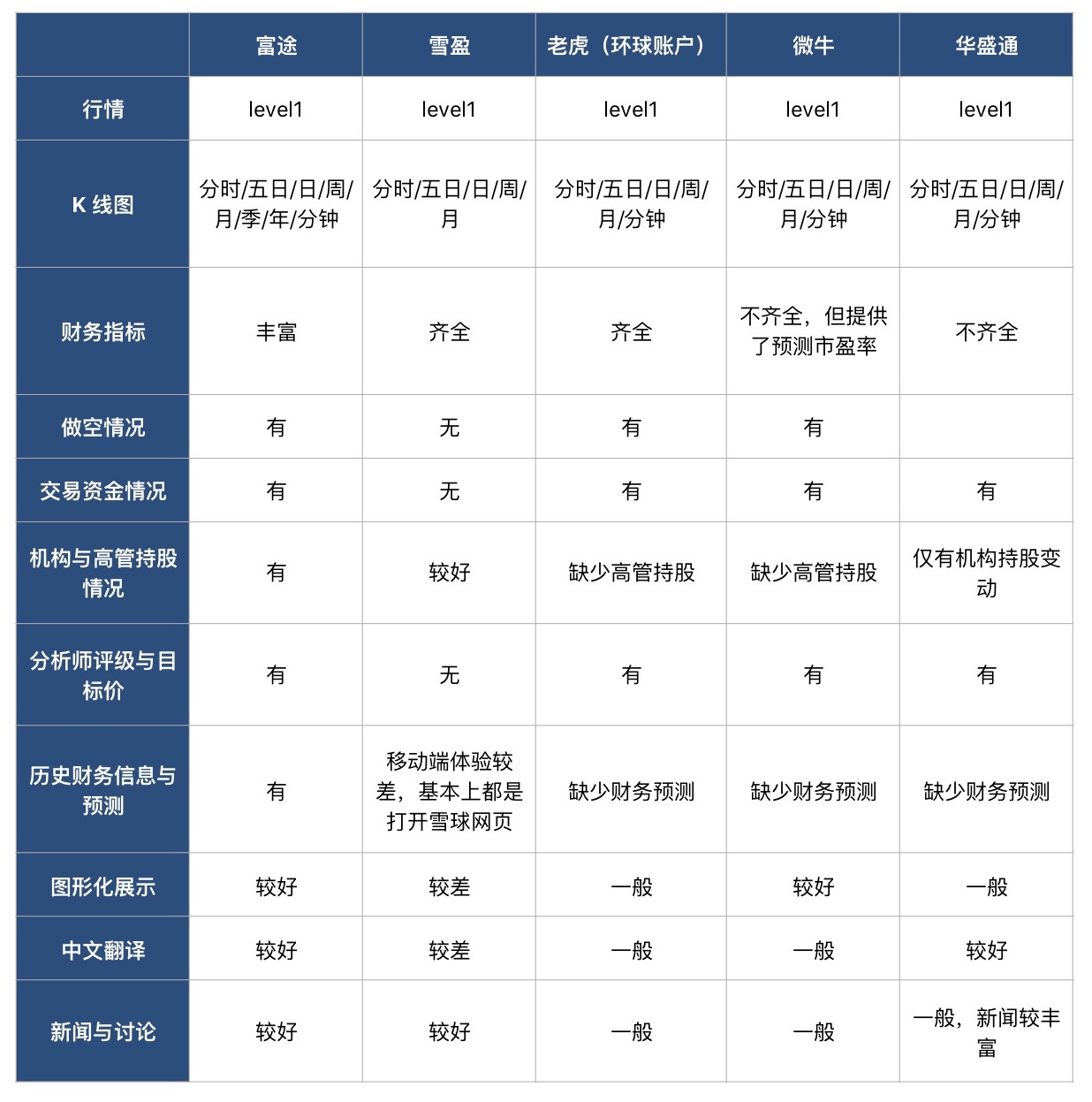 我们整理了这五个券商 app 的一些基本情况。从体验上来看,腾讯系出身的富途是最好的,在信息丰富度和展示友好度方面,都远远超出了另外几个同行。