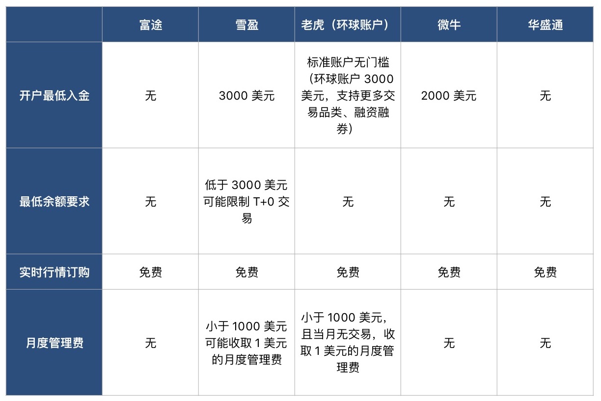 国内的互联网美股券商,相当于在你和盈透之间作为一个中间人,但有了这层中间人,对门槛和费用的要求就大大降低了。下表中我们列出了国内这几家券商的开户时的最低入金要求和最低余额要求。可以看到,基本上国内的券商免除了这一系列相关的费用和门槛。这其中要求最低的应该算是富途证券和华盛通,几乎没有任何门槛限制。
