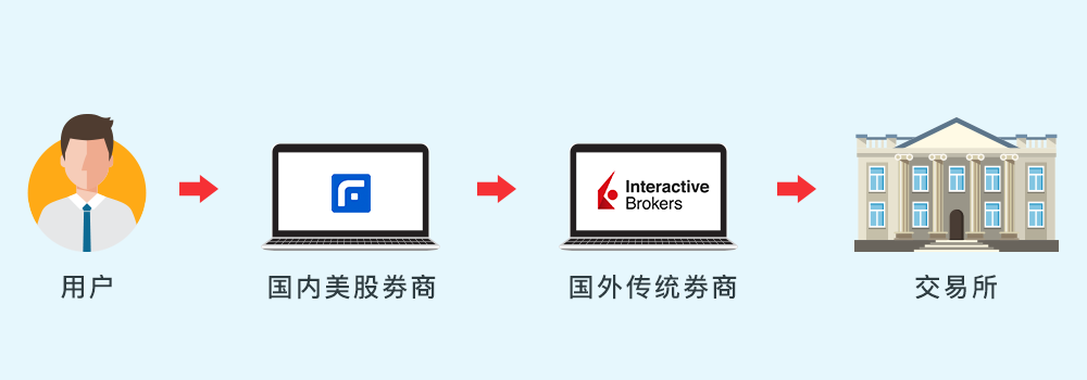 严格来说,国内的这些互联网美股券商,和国外传统美股券商的地位,并不等同。由于牌照和资质的问题,国内的互联网券商,实际上是国外传统券商的代理商。这个图可以帮助你更好的理解,国外的大型券商,也接受机构类型的客户,而国内的互联网券商就是这类机构客户。你在美股交易实际下单时,订单被提交给国内互联网券商,它再把这笔订单提供给它的上一级,即国外传统券商。