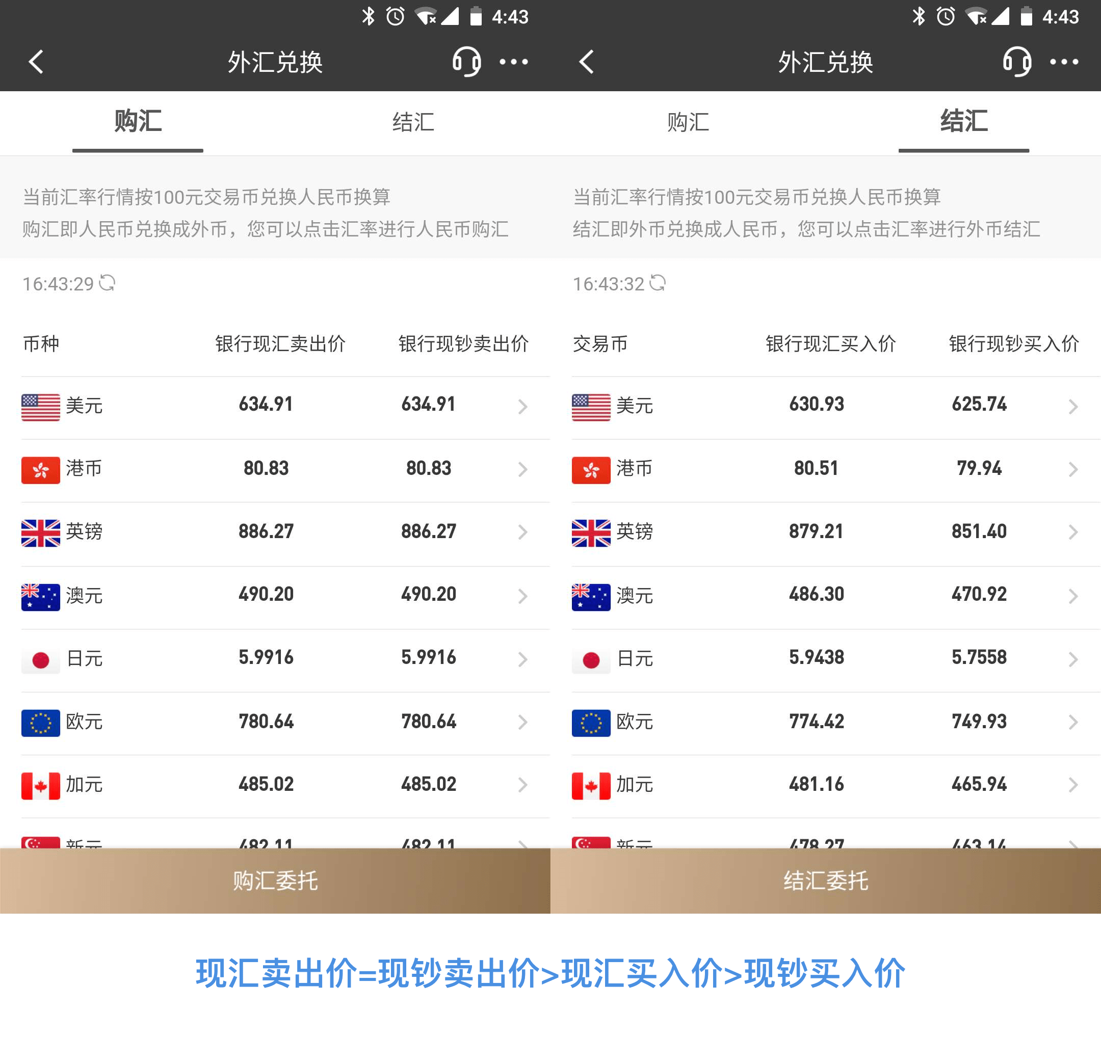 外汇中经常会涉及到几个概念,例如在招商银行的购汇界面上,我们看到了「现汇卖出价」和「现钞卖出价」,而你如果点到结汇,则有「现汇买入价」和「现钞买入价」,这四个东西到底是什么关系呢?如果你仔细观察,一定会发现这样一个规律,现汇卖出价=现钞卖出价>现汇买入价>现钞买入价。