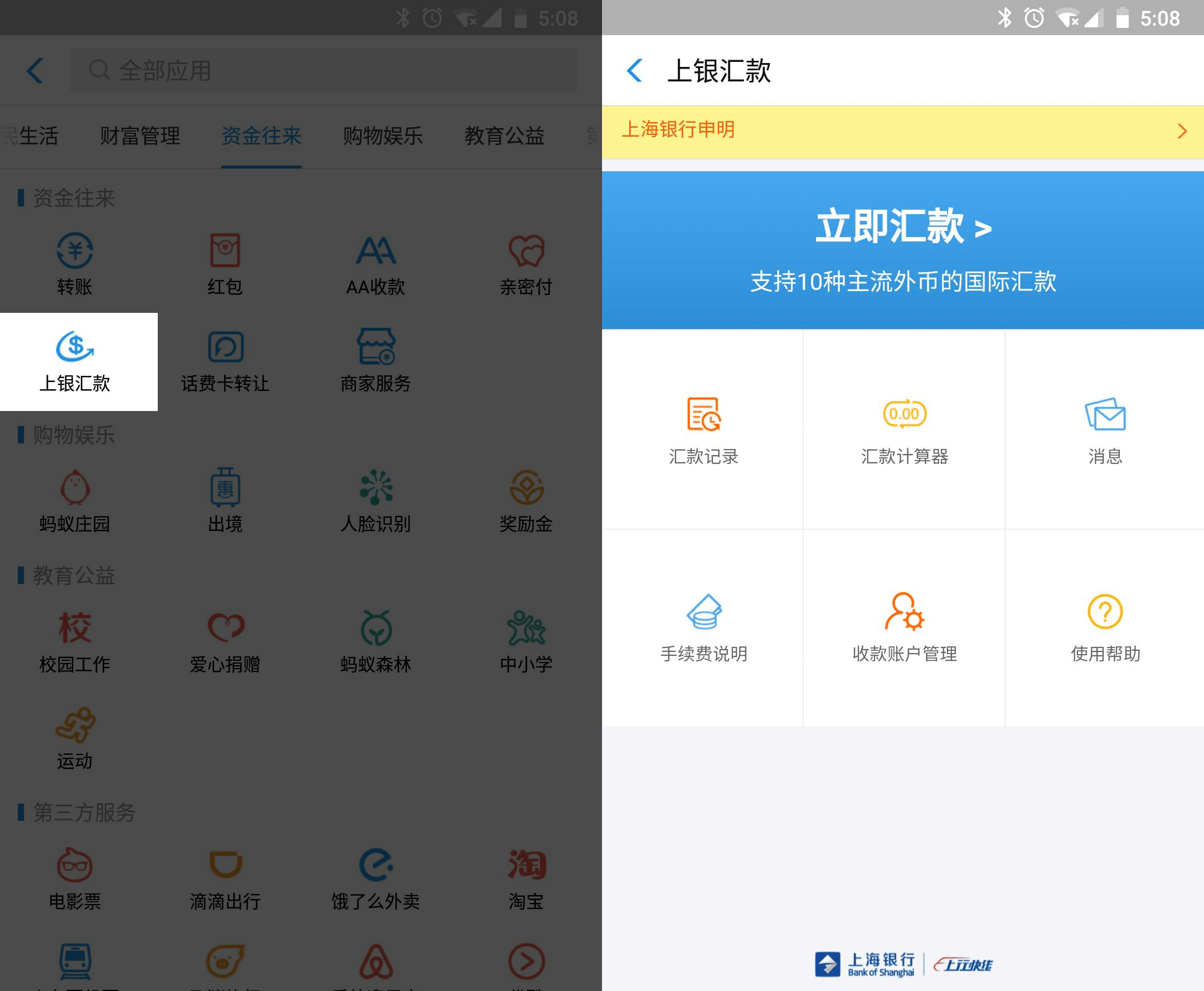 其次,在货币兑换和汇出美元时,可以考虑选择支付宝。支付宝提供的上银汇款是和上海银行合作的,相当于一次性帮你完成两个步骤:将人民币兑换为美元,同时汇至境外。好处在于,一方面上海银行提供的汇率有一定优势,此外,收费也较低。不同于上述表格中各家银行接近 200 元左右的手续费和电报费,支付宝的上银汇款只收取 50 元手续费,而且免征电报费。不过,支付宝每次最多只能汇出 3 万元人民币的等值美元。