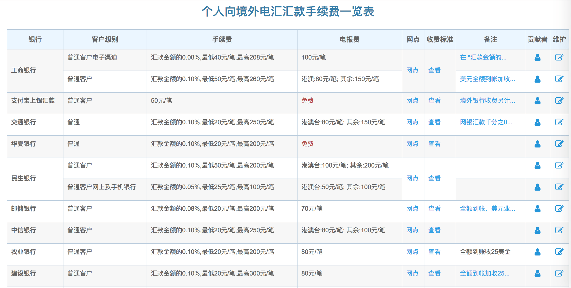 第 1 个费用已经说过了,不同银行人民币兑换美元的汇率是有价差的,一般来说,浦发、广发、民生、华夏等股份银行的汇率较为优势,而招商、中信、兴业等股份银行的汇率垫底,工商、建设、农业、中银等几家国有银行的汇率排在中游水平。汇率的报价可以查询「各银行汇率价格」。 第 2 个费用跟国内银行卡有关,不同银行汇出一笔外币的收费是不一样的。一般来说,这笔费用可以具体细分为手续费、电报费、中转行收费等。其中,手续费和电报费是国内银行收取的,中转行则是汇款过程中,部分资金会通过中间银行的中转而产生的费用。例如,在用内地银行向香港永隆银行汇入美金时,钱会先通过美国银行再转入香港永隆银行,由此产生了中转行费用。