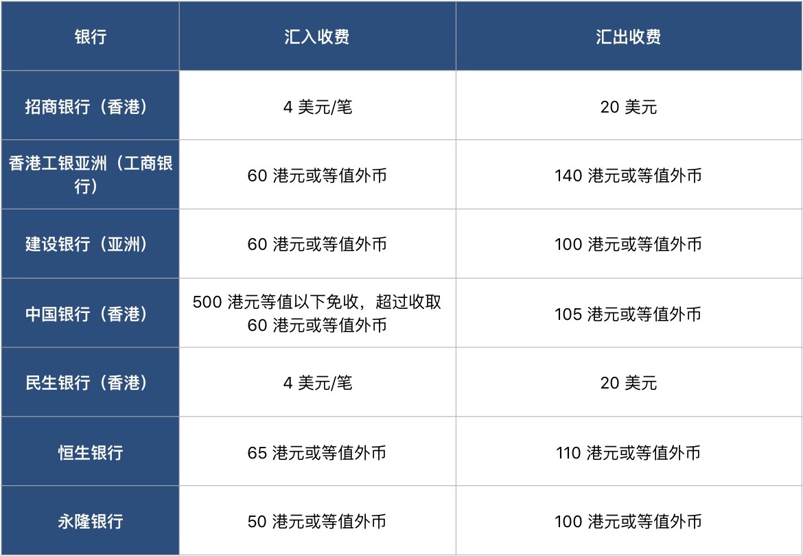同样,你可以在这里查询几大主要银行的汇款费用作为参考。 第 3 个费用是香港卡收到内地银行的入款时,一般来说也会收取一笔费用。同理,第 4 个费用是从香港银行卡向券商的银行托管账户转账,这时候汇出也需要收费。上面提到的几家支持内地开户的银行收费标准如下:
