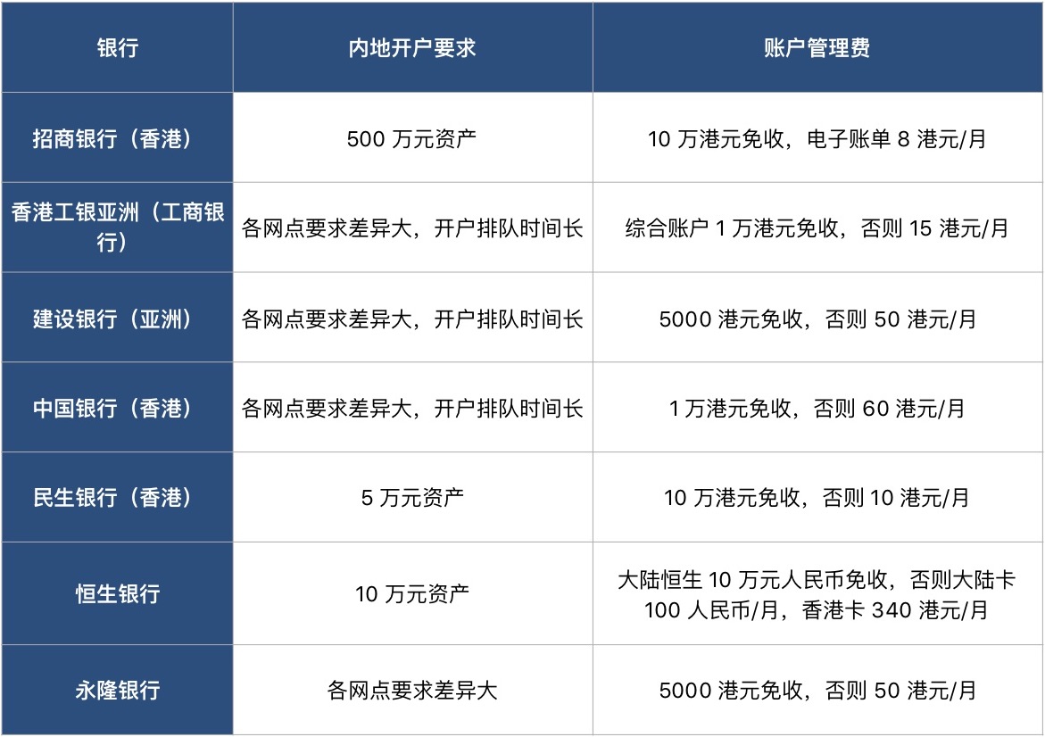 原先,招商的香港一卡通是许多人的选择。但自从 2017 年初加强外汇管制后,这条通道几乎被堵死了。现在,想要在内地招行网点开户,会要求连续三个月在招行的日均资产超过 500 万元人民币,除非你自己亲自到香港网点才没有这个硬性要求。不过,好在还有许多别的银行可以选择。