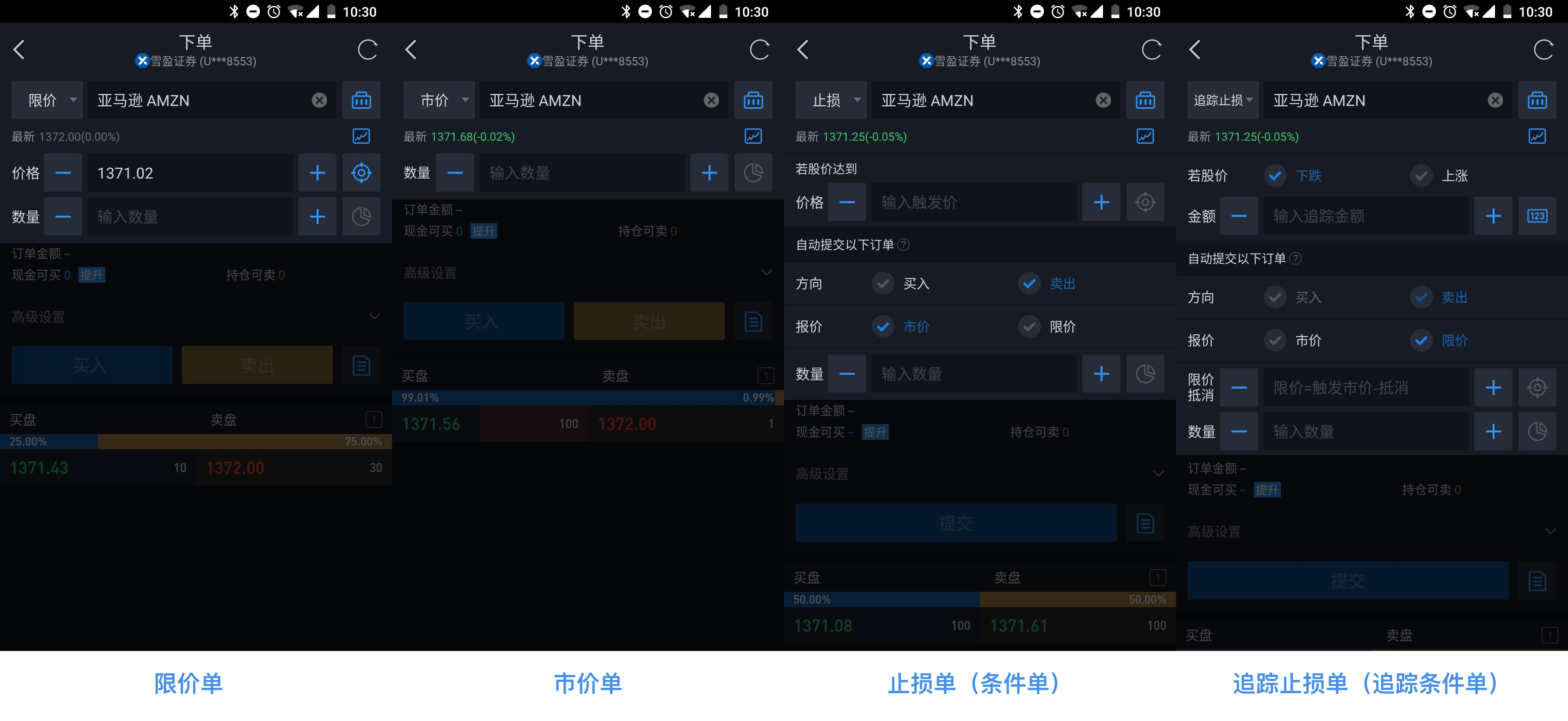 在不同的券商 app 中,这些订单类型的名称也不尽相同。例如,雪盈证券中是「限价单、市价单、止损单、追踪止损单」,在富途牛牛中则叫做「限价单、市价单、条件单、跟踪止损单」。这么一看,你可能会觉得有点晕,而且每次切换不同的订单类型时,下单时需要填写的参数也不尽相同。