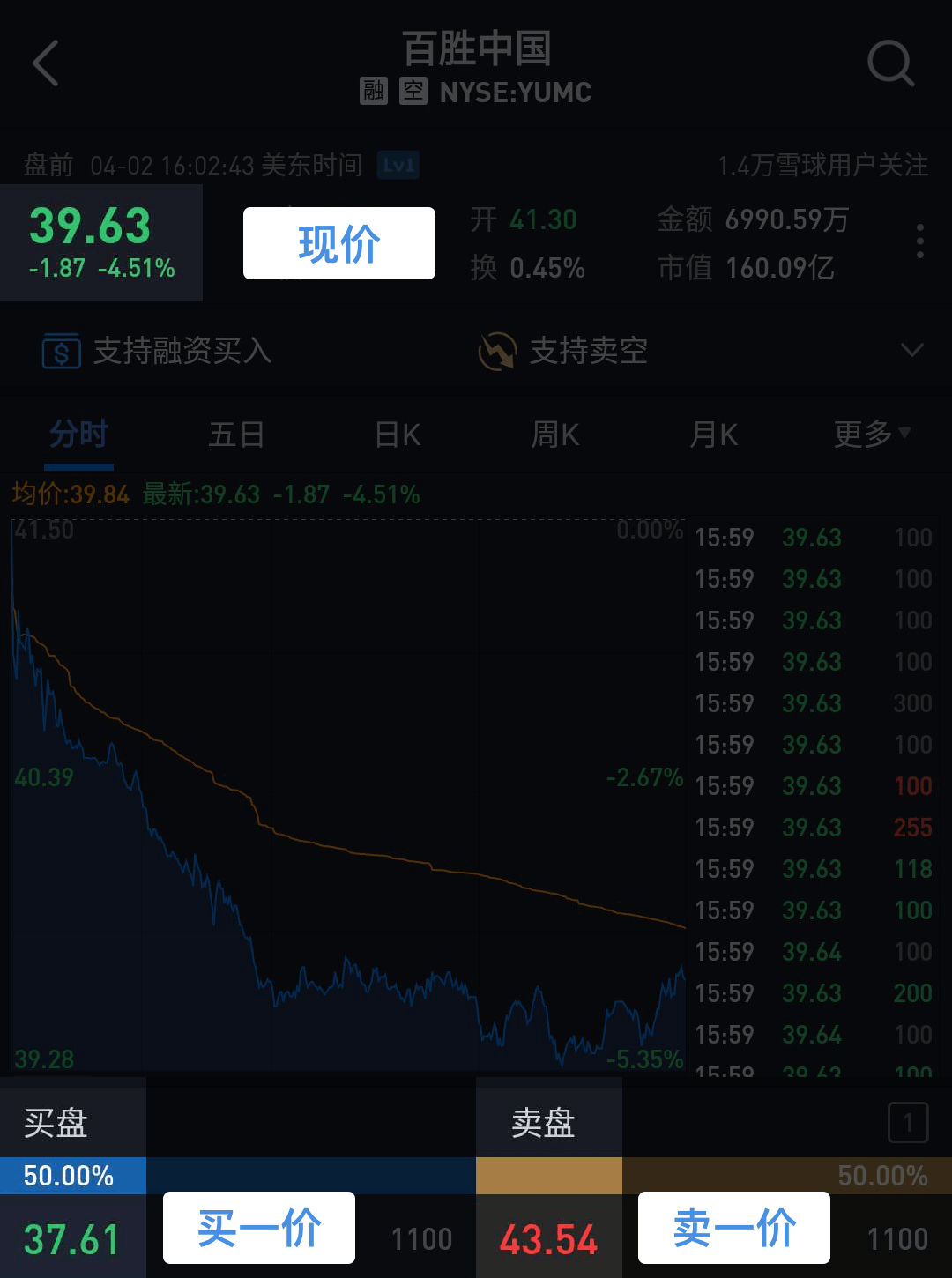 股票价格实际上是买卖双方达成共识的结果。现价就是最后一次成交的价格,有人出 39.63 元愿意买入百胜中国,同时有人出 39.63 元愿意卖出百胜中国。在此时此刻,百胜中国正在等待着下一次买卖双方达成共识,来刷新股价。那么,最有可能成交的价格是什么呢?就是买一价和卖一价。