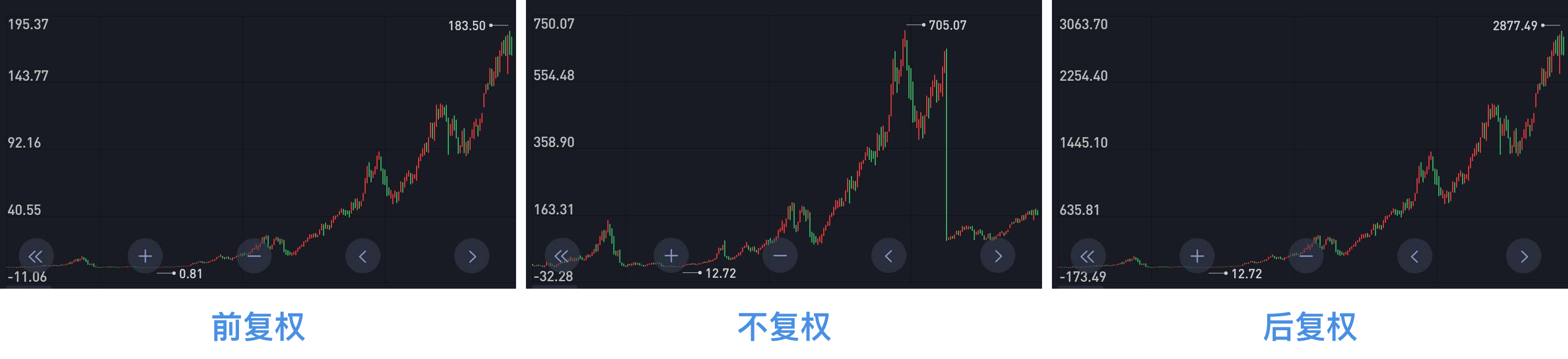 可以看到,默认的显示是前复权(最高价格为 183.5 元),如果手动调节到不复权,中间出现了一个断崖式的「滑坡」(最高价格为 705.07 元),而选择后复权,则图形的模样与前复权一致,但最高价格由 183.5 元变成了 2877.49 元。