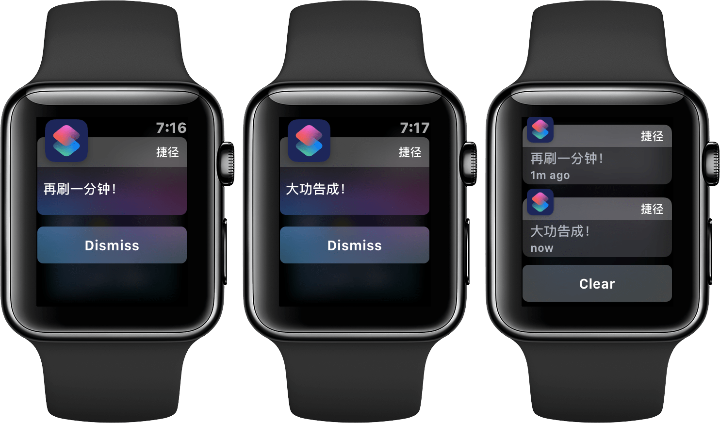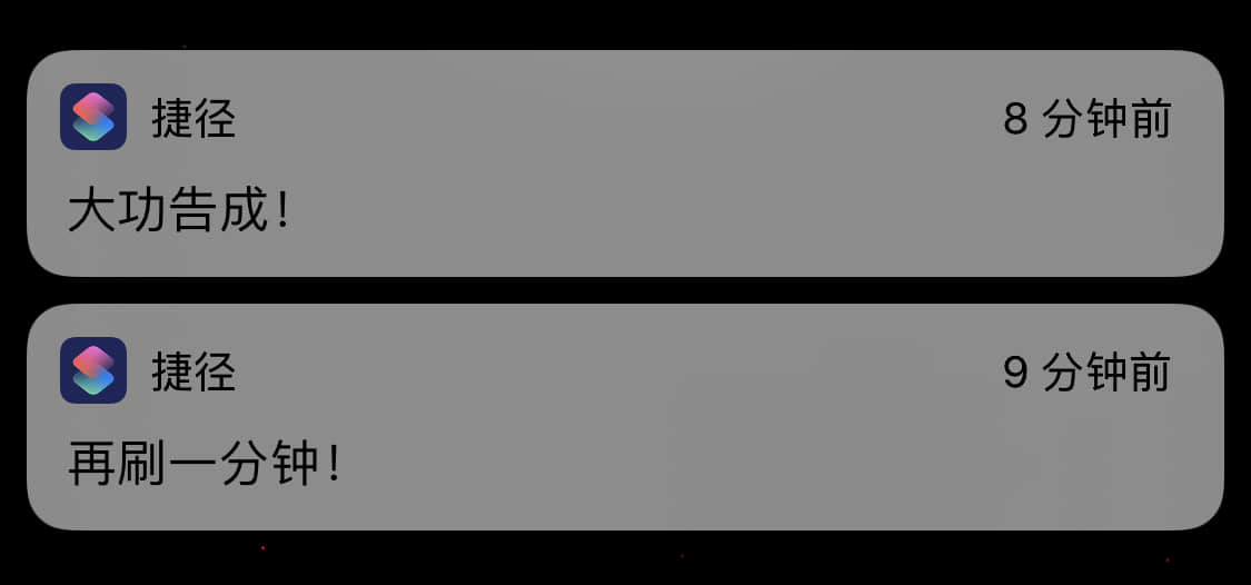 我们开始刷牙前运行这个捷径,运行后捷径就会按照预定,每分钟给 1 次通知,总共给两次: