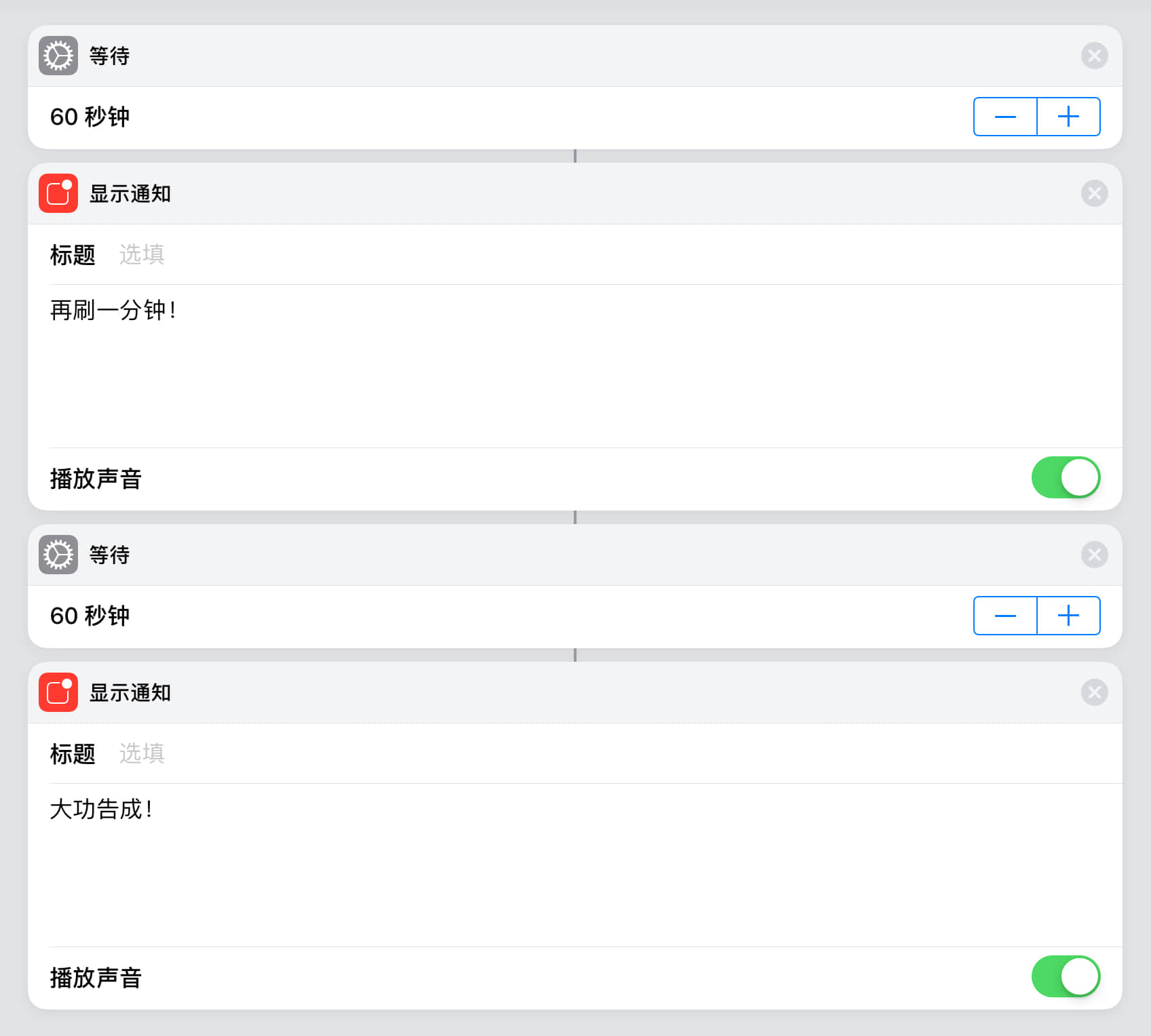 其实那个「通知信息」,就是那个「再刷一分钟!」和「大功告成!」也可以不填,不填的话还是会弹出通知,只是通知没有内容而已,不会对整个捷径造成很大的影响。