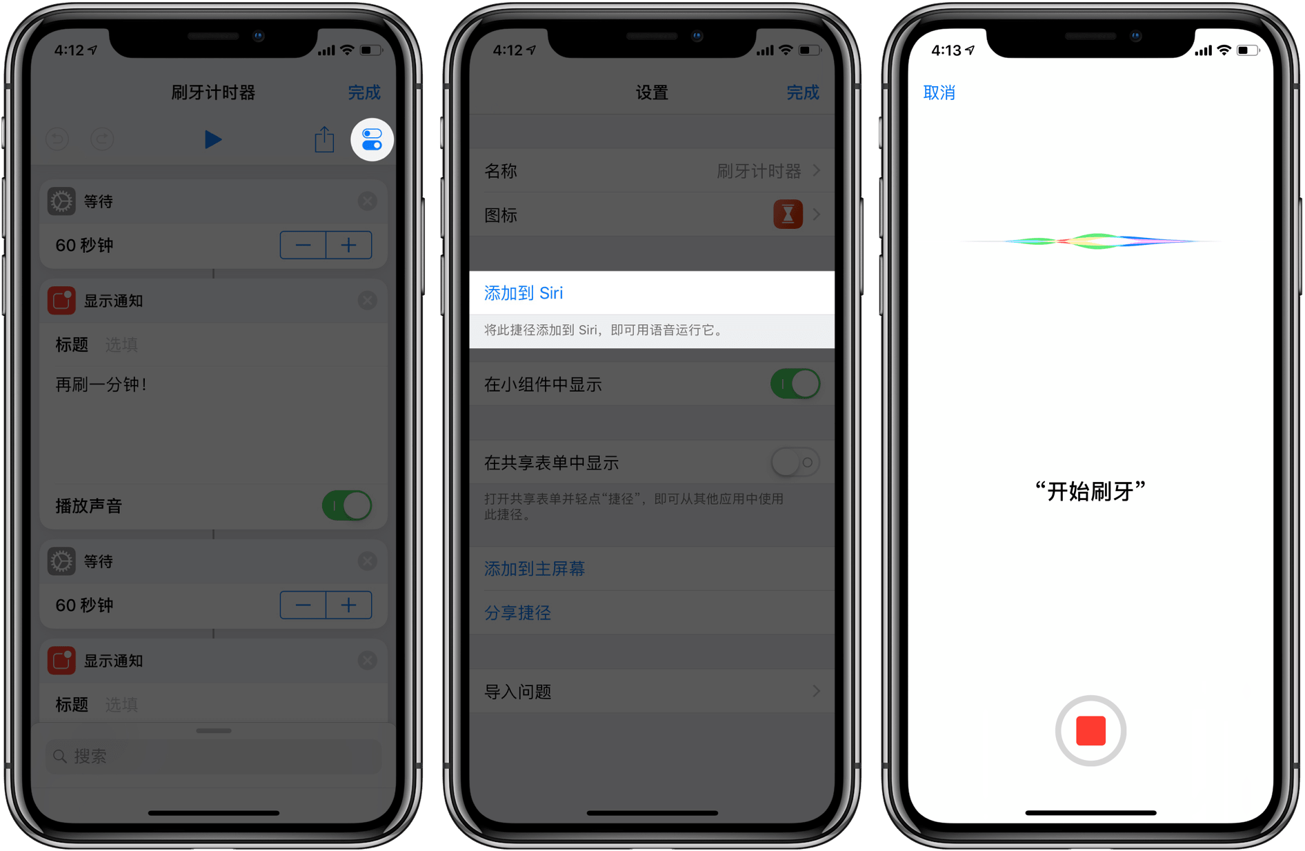 除了在通知中心运行之外,捷径也可以通过 Siri 运行,这种方式也很符合刷牙计时器的场景,而且更加灵活。连看都不用看,直接跟 Siri 说一声,计时就开始了。
