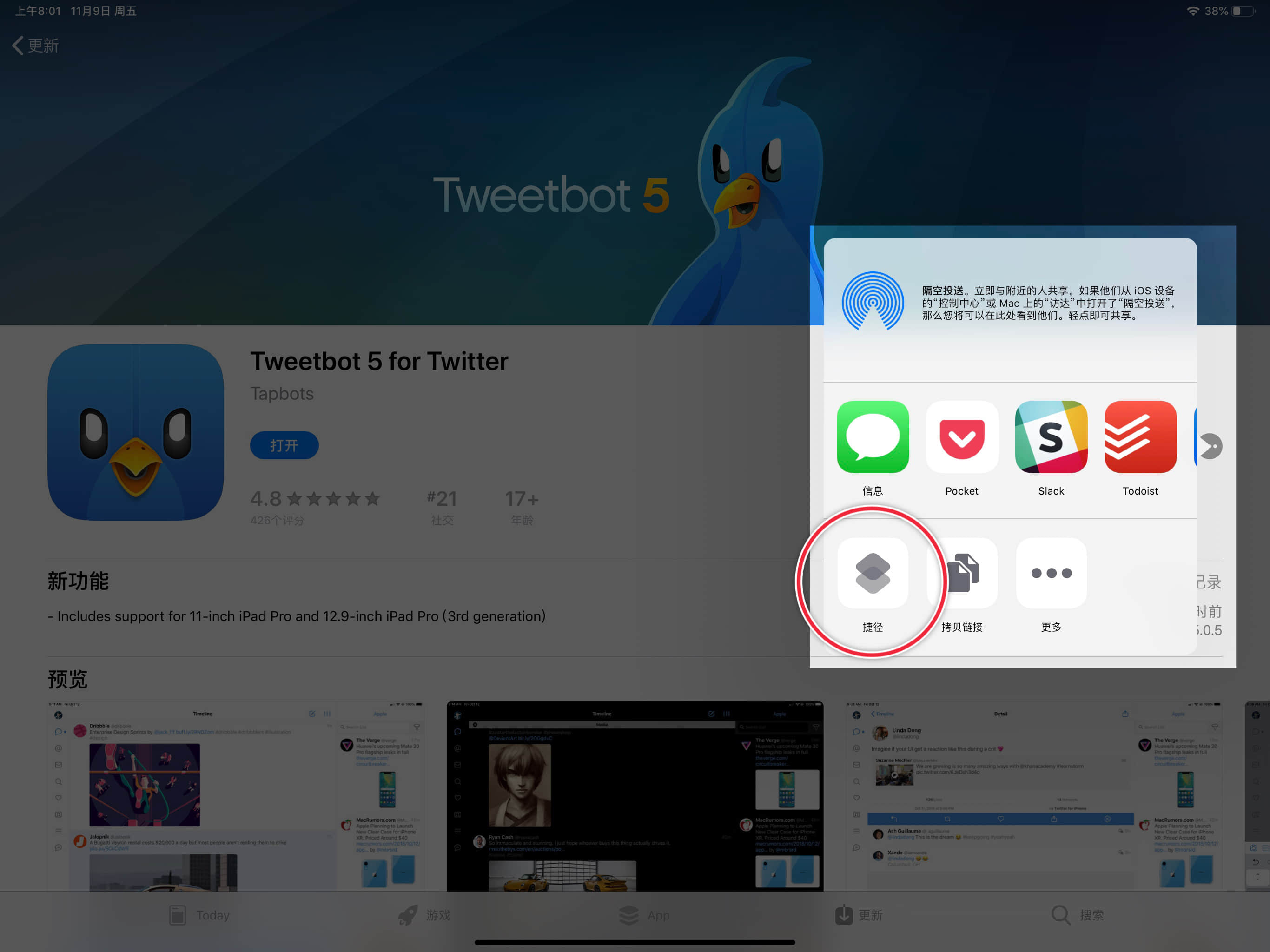 在最主要的运行捷径的方式里,目前只剩下一样,那就是通过共享表单(Share Sheet)来运行它。我们会在大量情境下通过共享表单运行捷径,其中一部分就是这周和 App Store 打交道的时候。
