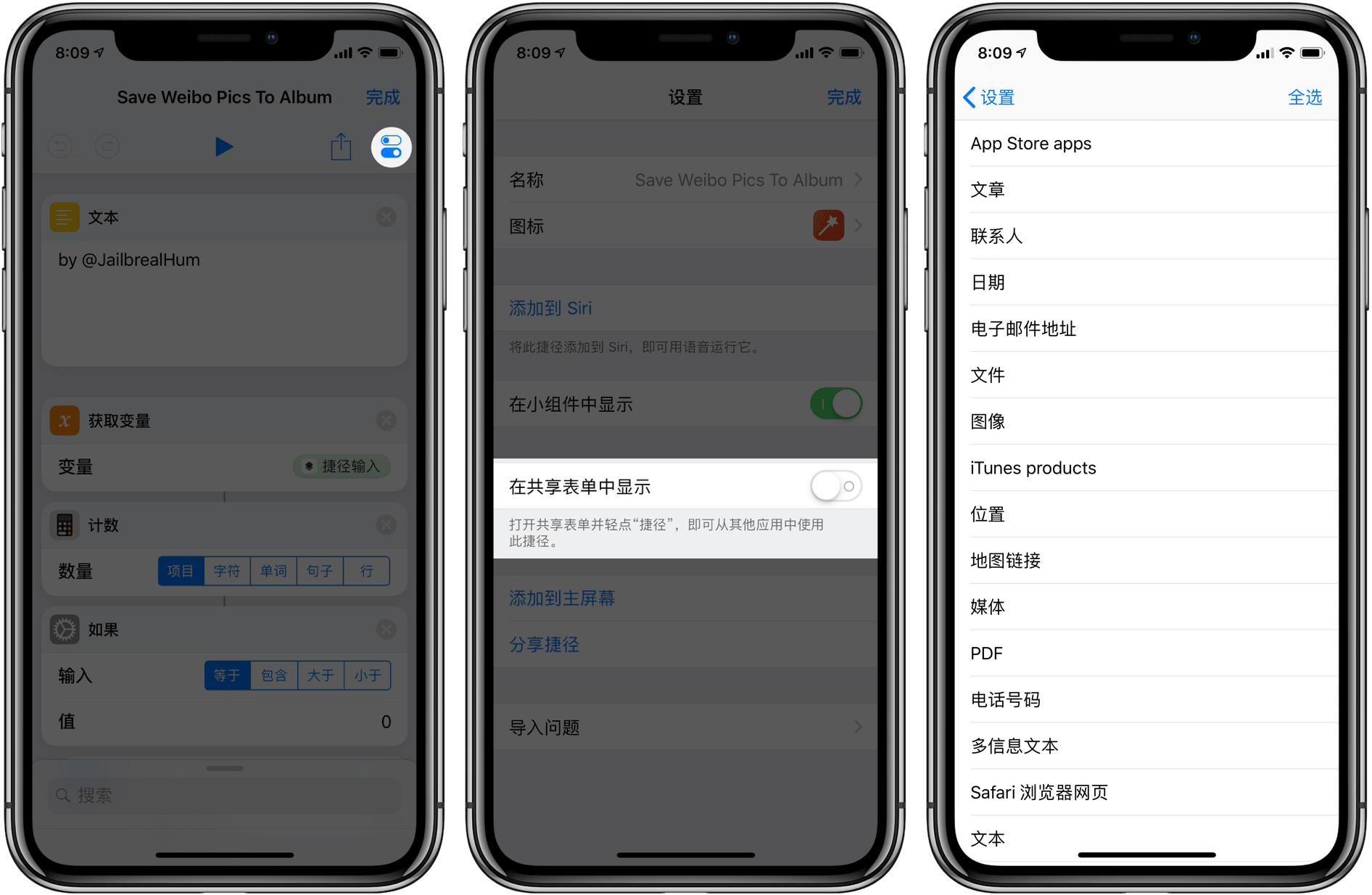 最后一幅图中,显示的就是捷径可以通过共享表单接收的内容类型。所谓「类型」,就是说捷径将它从共享表单接收的东西进行了分类。
