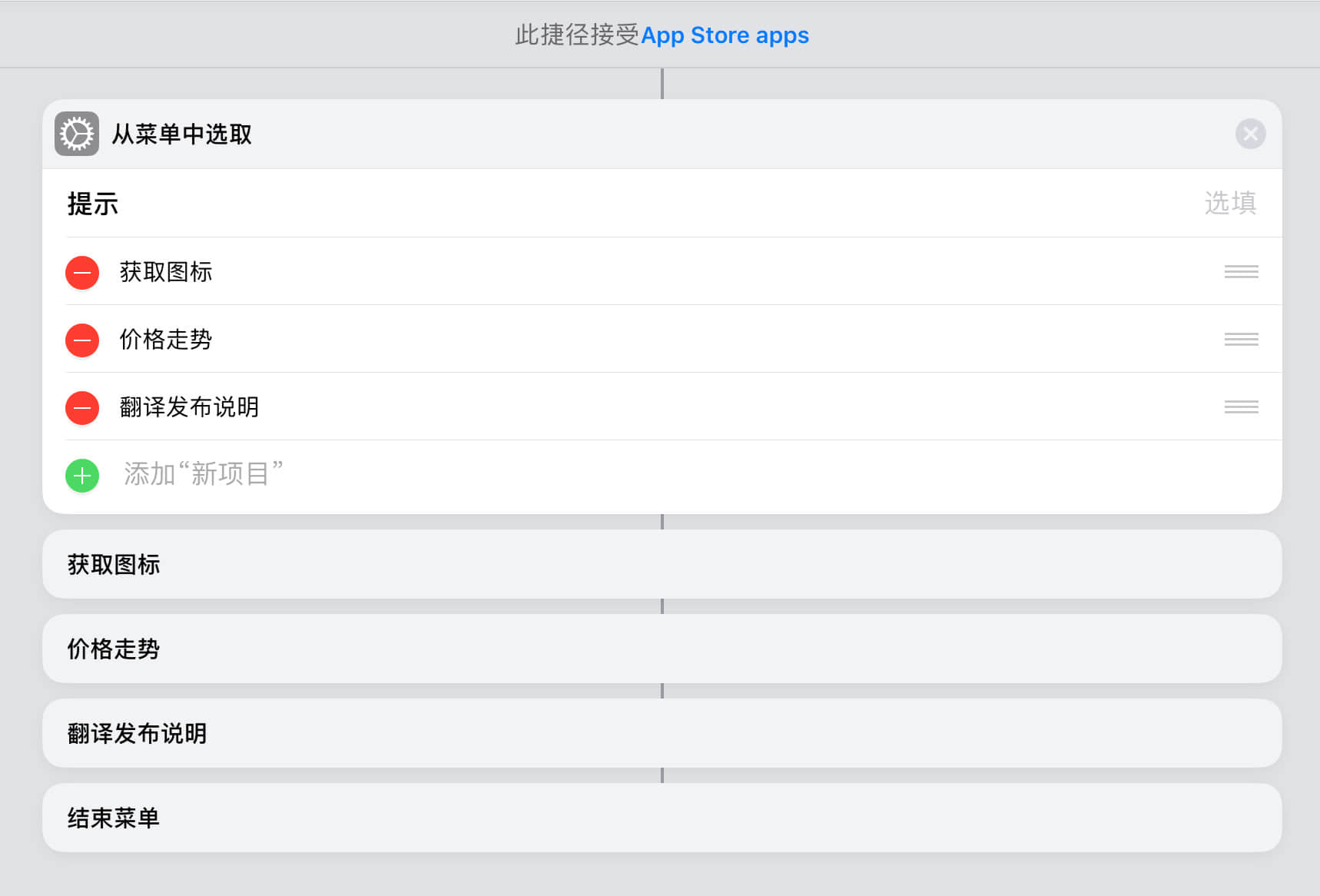 那么有没有什么办法,能把像这周这 3 个 App Store 捷径这样相关度这么高,运行方式又一致的捷径放在一起,做一个「App Store All in One」的捷径,用的时候根据需求,临时选一下是查价还是获取图标就行呢?