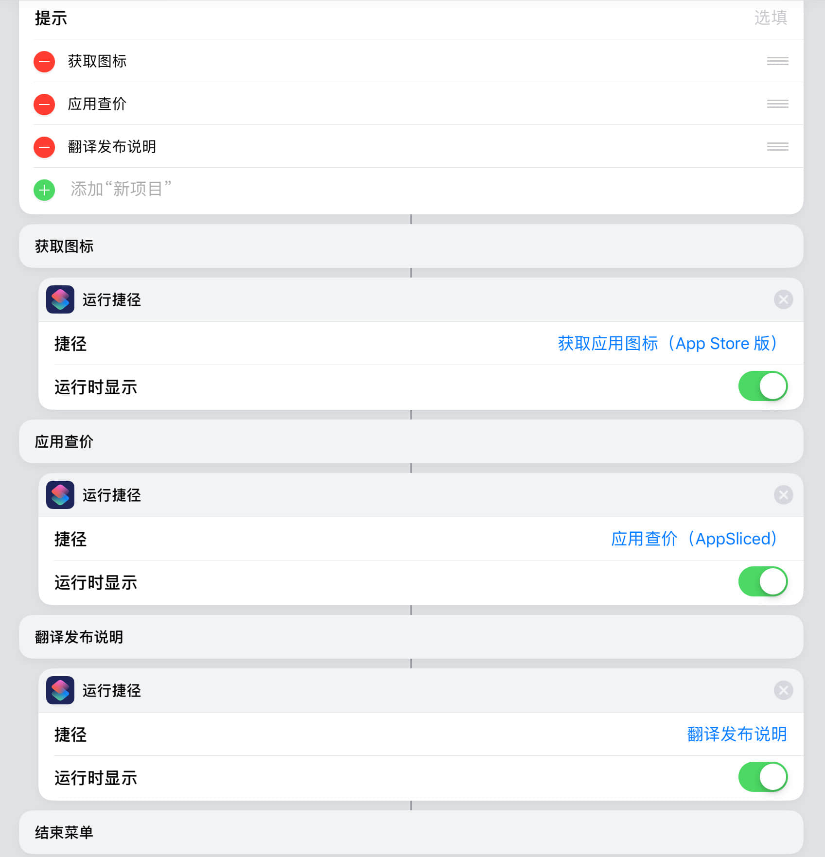 最后的最后有一个捷径安排上的小思路:建议把合集类捷径放在比单独功能的捷径更靠前的位置,因为一般合集类的做出来,被包括在合集内的单独功能的捷径实际上就变成了合集类捷径的一个零件,使用的频率会降低不少。比如这次大家做出了「App Store All in One」的捷径,那就可以把「获取图标」、「应用查价」、「翻译发布说明」这三个操作放到捷径库的后面。