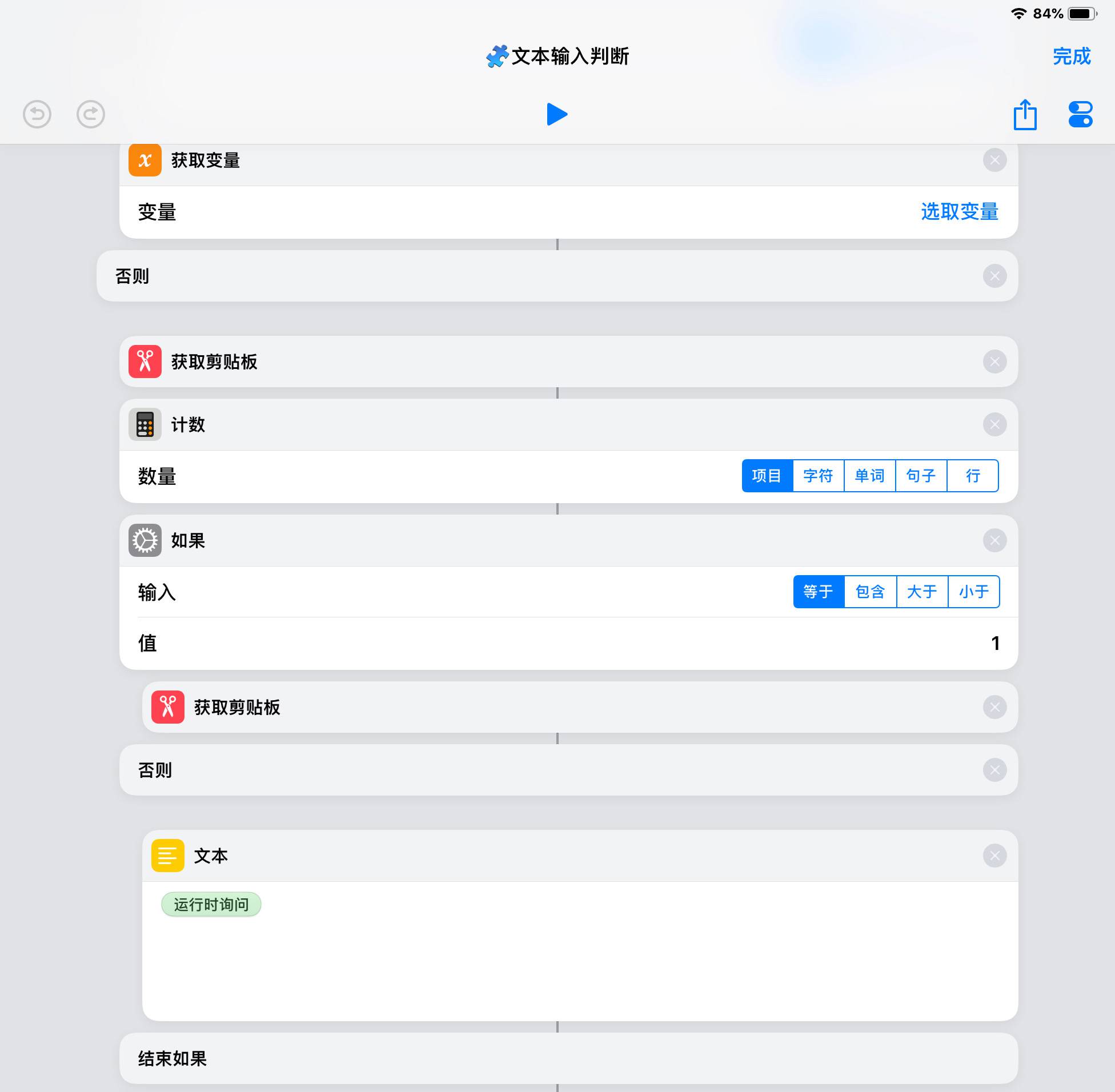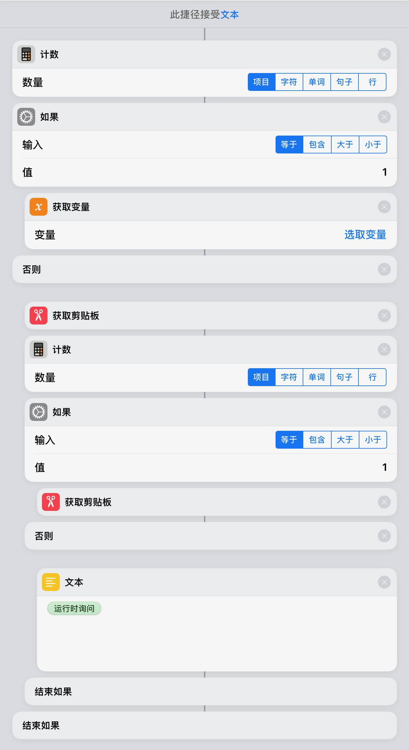 所以这一层条件,其实是在上一层的条件之下的。也就是说,这一层逻辑是在上一层逻辑的包裹之中的。在捷径中,它的表现方式就是在「获取剪贴板」这个操作下面,再加一次计数判断。