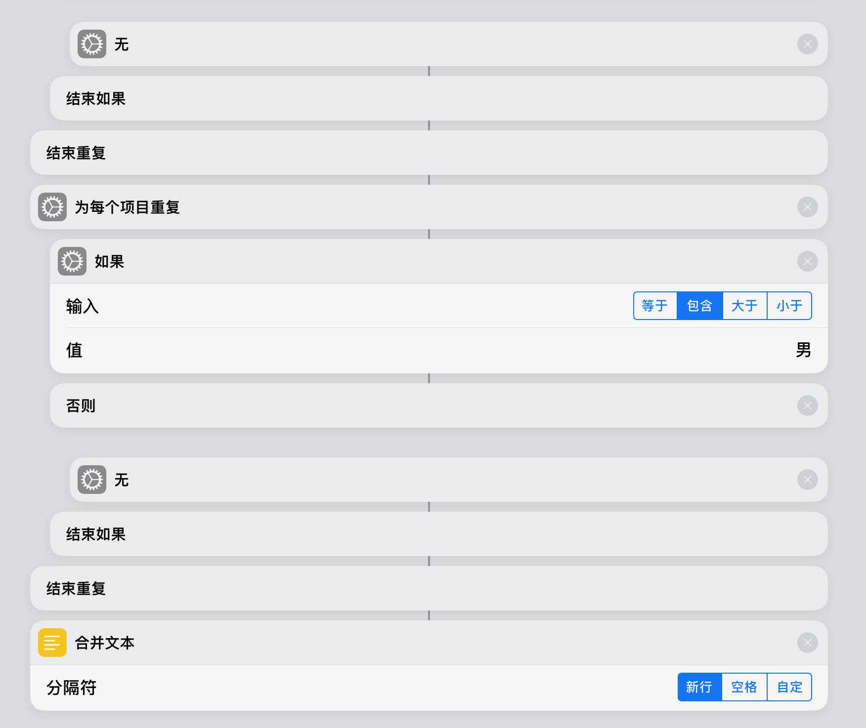 在「为每个项目重复」下,我们还是放上条件操作「如果」,但这一次不必取数字这么麻烦了,只要在「如果」的「输入」里选择「包含」,在值里填入 男 就足够: