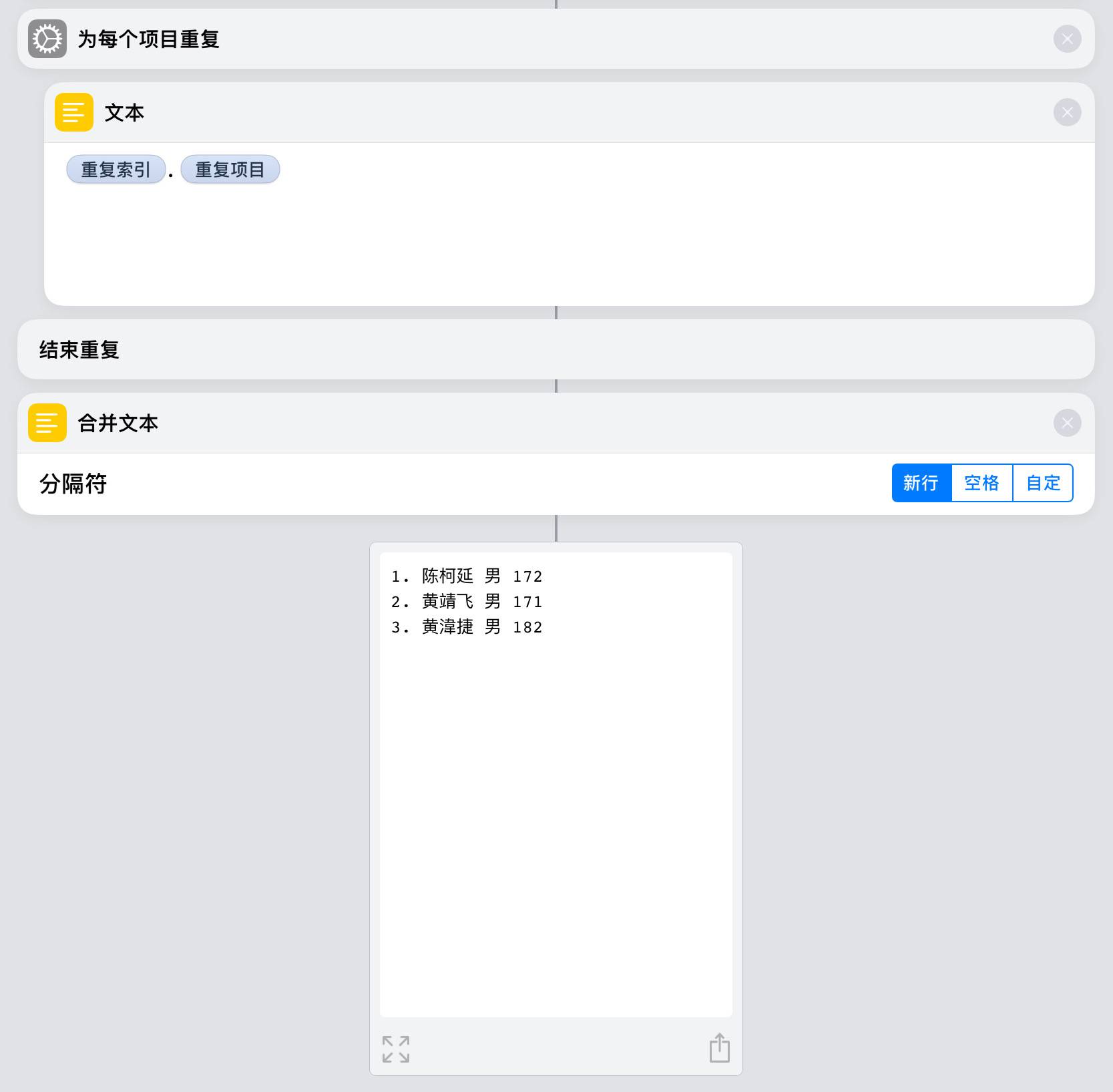 拿我们这个捷径来说。当我们第一次运行这个捷径时,理所当然的,「为每个项目重复」检查的第一项数据,就是名单的第一行,也就是 庄美胤 女 173。