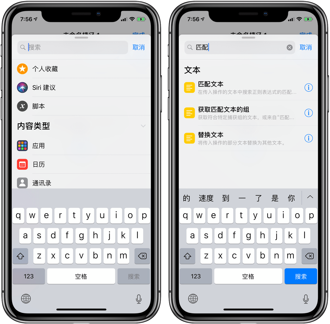捷径中关于正则表达式的操作有 3 个,搜索匹配就可以看到它们: