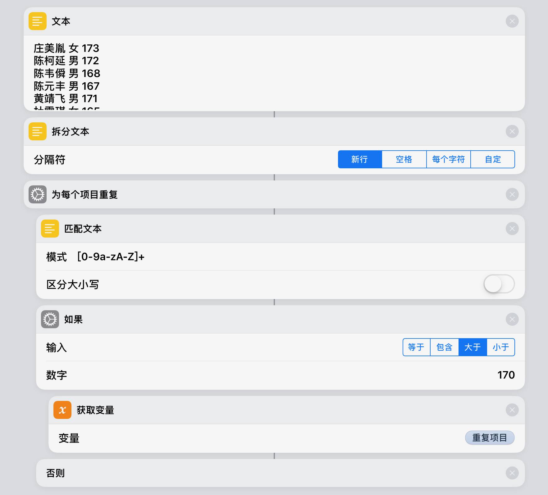 因为其实我们在这一步如果什么也不填,相当于告诉捷径:如果数字大于 170,那么获取「重复项目」,否则获取数字。