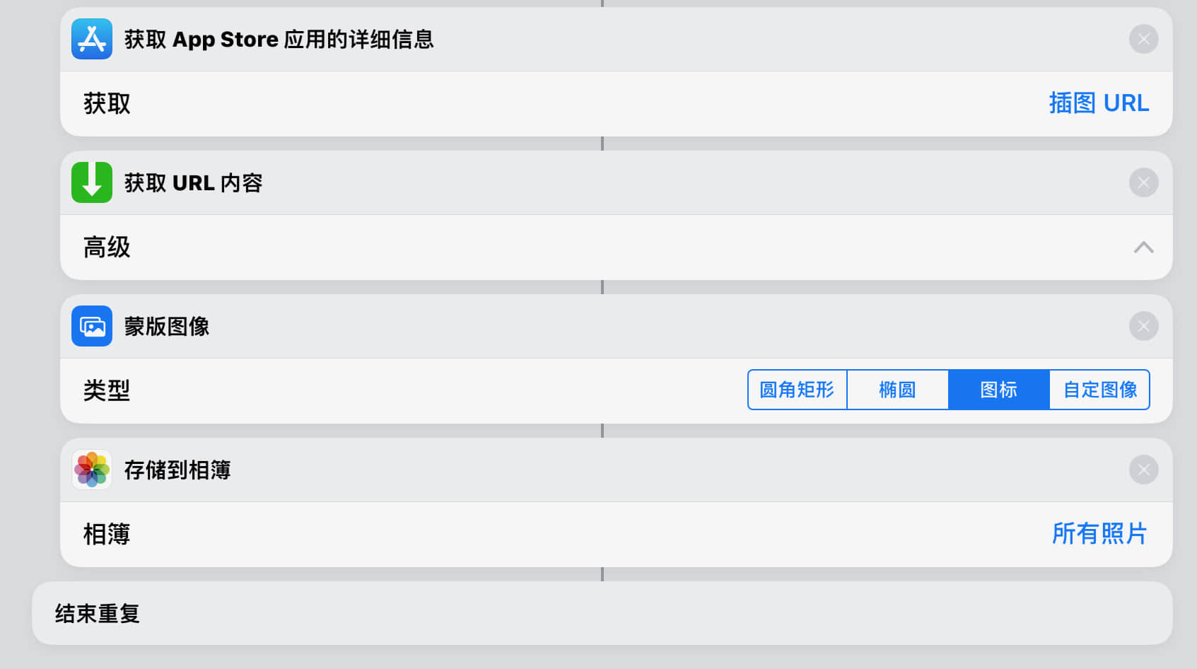 在能够做到脱离 App Store 获取图标后,我们来看看如何解决批量的问题。看到「批量」,就要想到「重复」那两个操作。在捷径里能做重复的操作有两个: