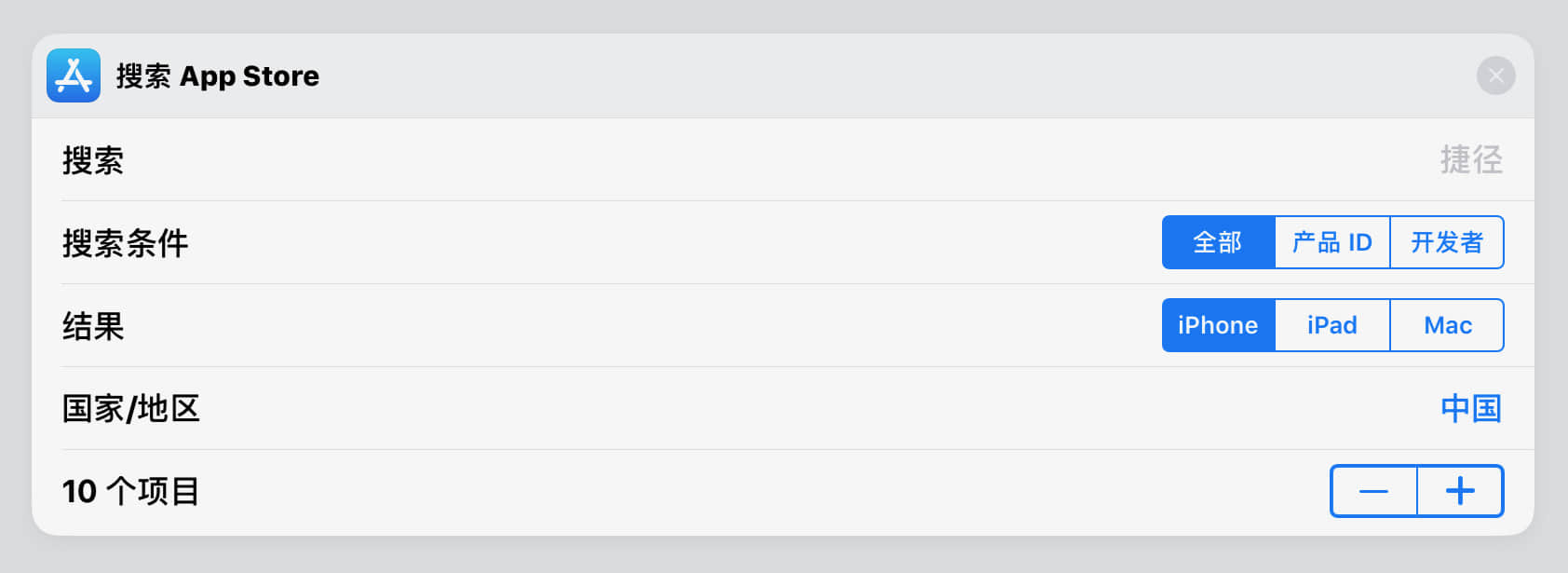 搜索应用名的结果很未必会理想,App Store 的搜索能力还是公认的差。所以搜索结果我们应该多给几项,然后接上「从列表选取」,从中选择我们本来想要的那个应用,再接上「获取 App Store 应用的详细信息」,只获取我们想要的应用的详细信息。